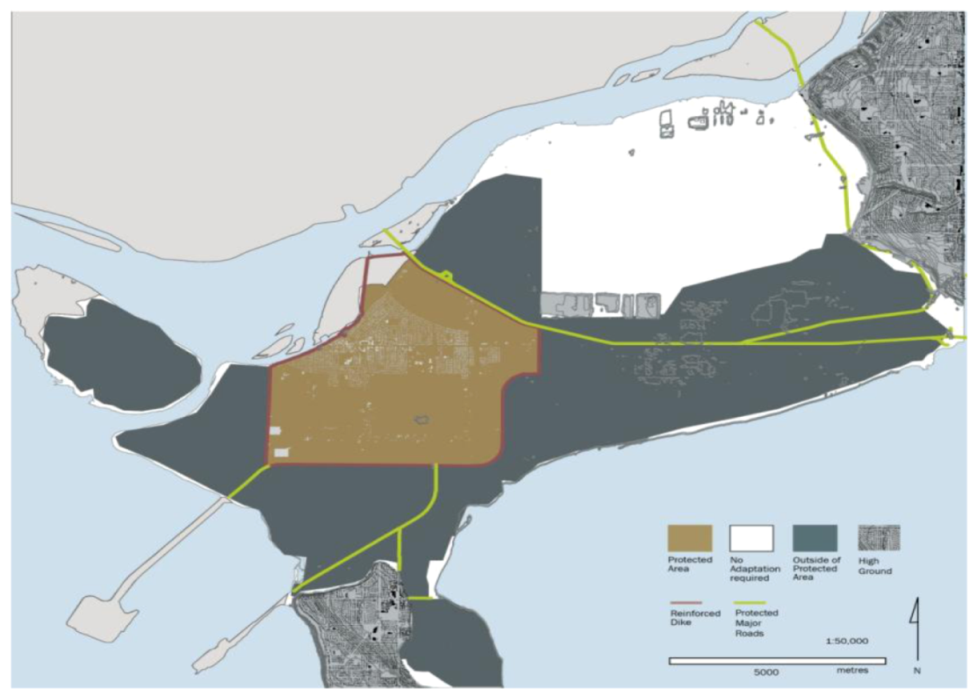 | Policy change required | Degree to which current policies would need to be changed | Based on outcomes of policy workshop with Delta planning staff | N/A | Most in accordance with current policy | In accordance with current policy, though extensive barrier islands new for Delta | Retreat is least in accordance with current policy | Use of Flood Construction Levels in accordance with current policy |