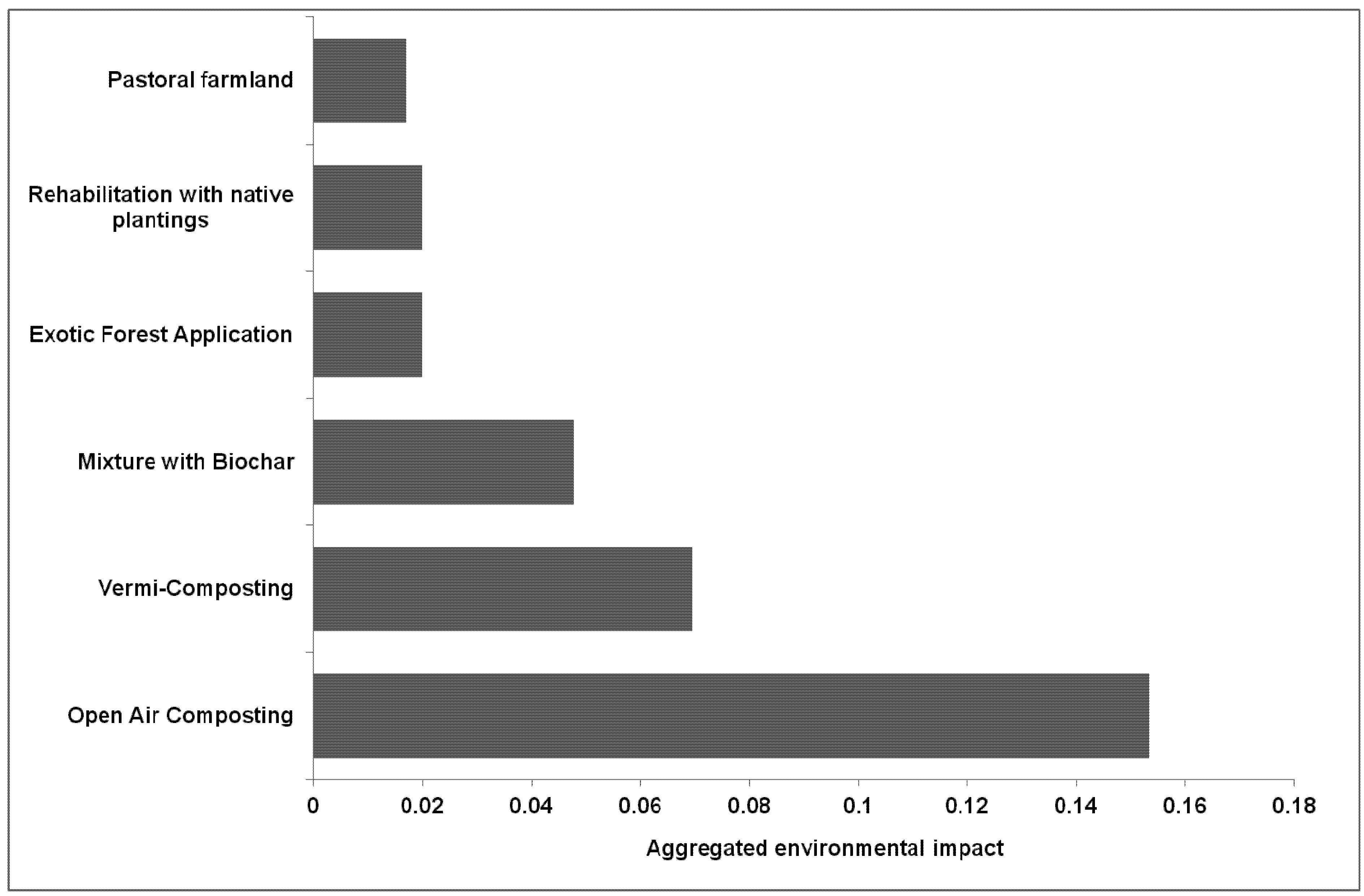 | Impact Category | Unit | Landfill | Open Air Composting | Vermi-Composting | Mixture with Biochar | Pastoral Farmland | Exotic Forest Application | Land Rehabilitation |