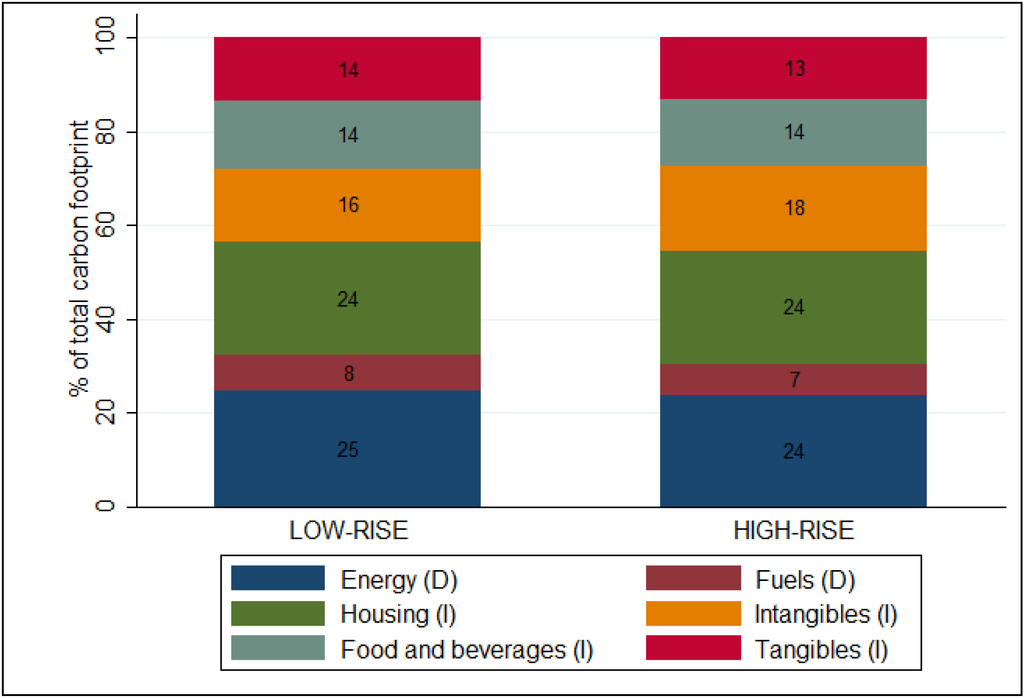 Looking at the averages, our results indicate that low-rise dwellers have higher carbon footprints than high-rise dwellers. The low-rise residents tend to be households with higher income, more children, and living in owner-occupied houses. However, the differences in the average amount of GHGs, both in absolute and relative terms, between the low-rise and high-rise dwellers are rather moderate compared with the figures from earlier literature. Many authors suggest that less-dense suburban living is approximately two times more energy- or GHG-intensive than inner-city living [3,4,10,34]. VandeWeghe and Kennedy [5], for example, come up with a yearly difference of 1.3 t CO2-eq and smaller for those living in inner Toronto. Their result is rather close to our estimation of 1.8 t CO2-eq.