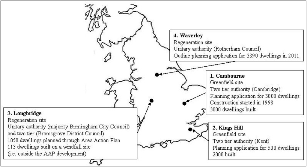 Map showing locations of the four case study sties, as well as indicating the type of site (regeneration or greenfield), the type of local authority, and the number of dwelling planned and built.