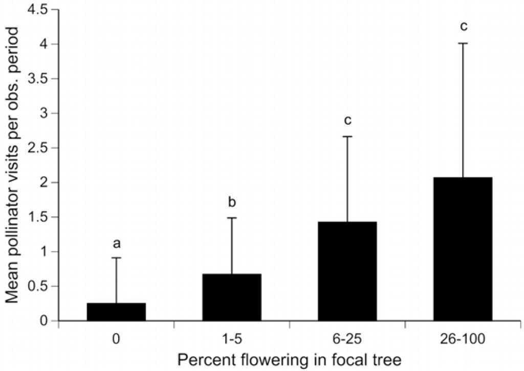 Pollinator visits to I. edulis trees increased with increasing flower cover. 2007–2008 restoration sites in Costa Rica. Bars with different letters are significantly different at the p < 0.05 level. Errors bars are standard deviations.