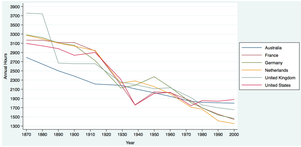 Figure 2 shows that Americans work today almost as much as they worked in the 1930s [], when they were leaders in reducing working hours (note: due to inconsistent data collection techniques across countries, these trend lines should not be compared in terms of levels). Average annual productivity gains in the US since then have been in the order of 3% but have not translated to less work, but hourly wages have declined in real terms since the 1970s. Both these factors have intensified recently. For example, the excess of US labor productivity growth over hours change rose to a nearly four-decade high of 3.1% in the period 1995–2000 [].