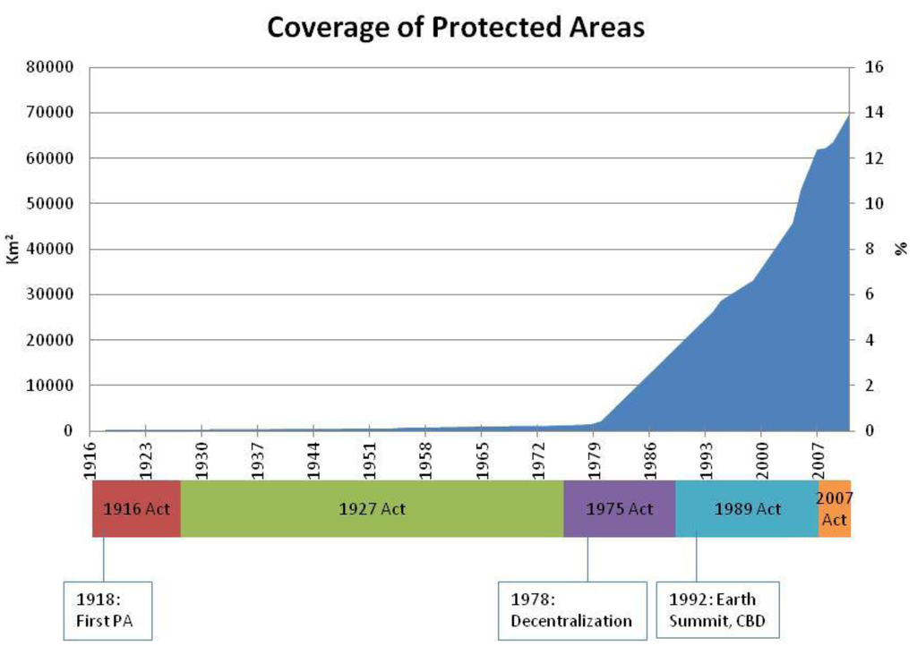 Cumulative curve of nationally designated protected areas in Spain. The bar below indicates the periods during which parks were regulated by different protection laws. Source: Redrawn from Troitiño [26], Mulero [27] and EUROPARC-España [28].