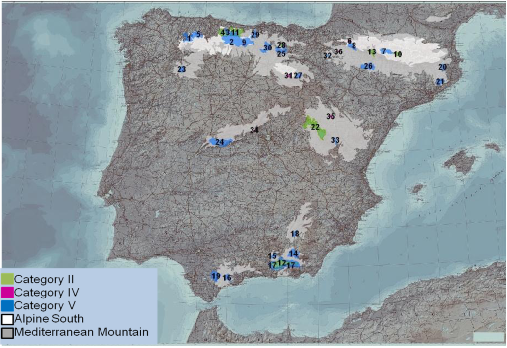 Two map sources were used in this process: a vegetation zone map from Mücher et al. [23] and a Spanish PA boundary map developed by EUROPARC-España [36]. The first map, LANMAP2 (Alterra), is a Pan-European Landscape Database that classifies 350 different European landscapes [23]. We selected sites that were classified as Alpine south or Mediterranean mountain vegetation zones. The map from EUROPARC was updated in December 2009 and includes Spanish PAs defined by the Law 42/2007 of Natural Heritage and Biodiversity and by the Natura 2000 network that were included in the autonomous community’s legislation [36]. The EUROPARC map does not include PAs established under other international agreements.