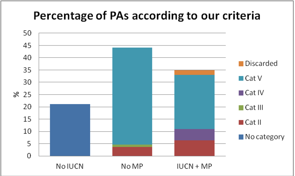 The failure to develop national policies that would have coordinated the PA management of central and local governments since the declaration of the 1978 Act has most likely resulted in large variations in the aims and regulations of Spanish PAs. We analyzed how this variation affects the performance of PAs using the international category system established by the IUCN, which aims to standardize PA classes to enable comparisons within and between countries and to prioritize investments for countries with low coverage of certain IUCN categories [32].