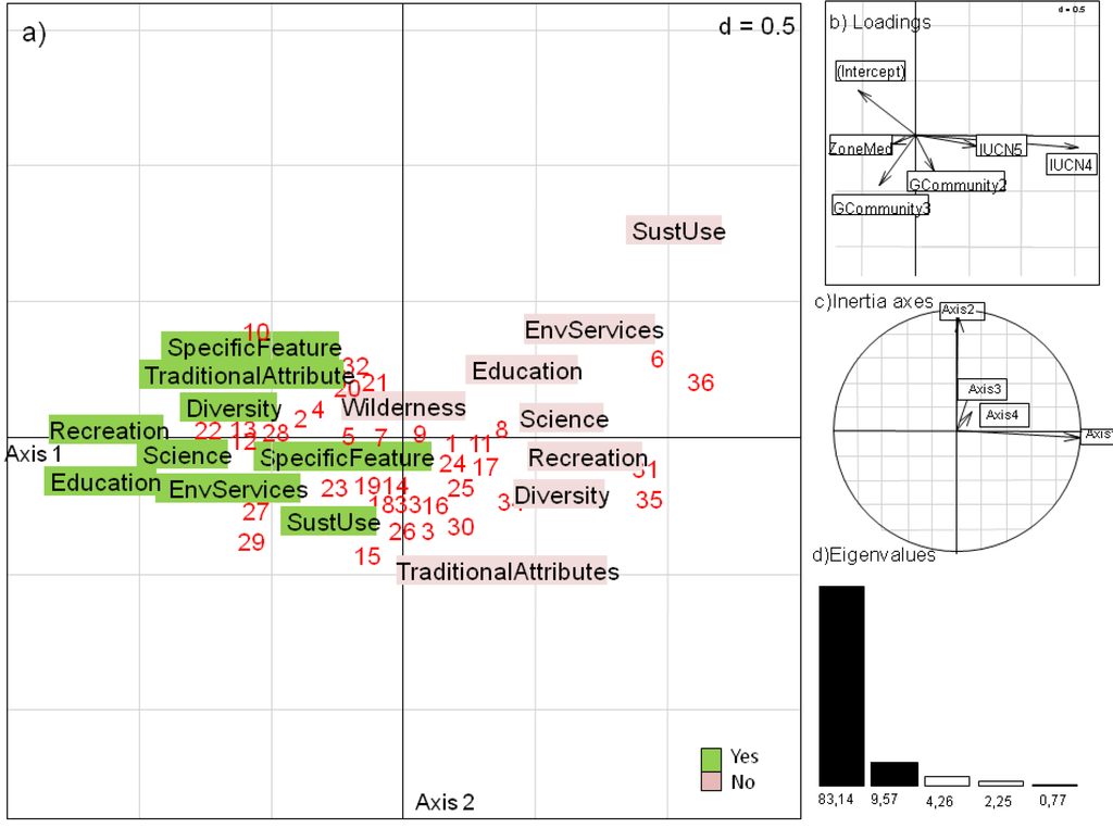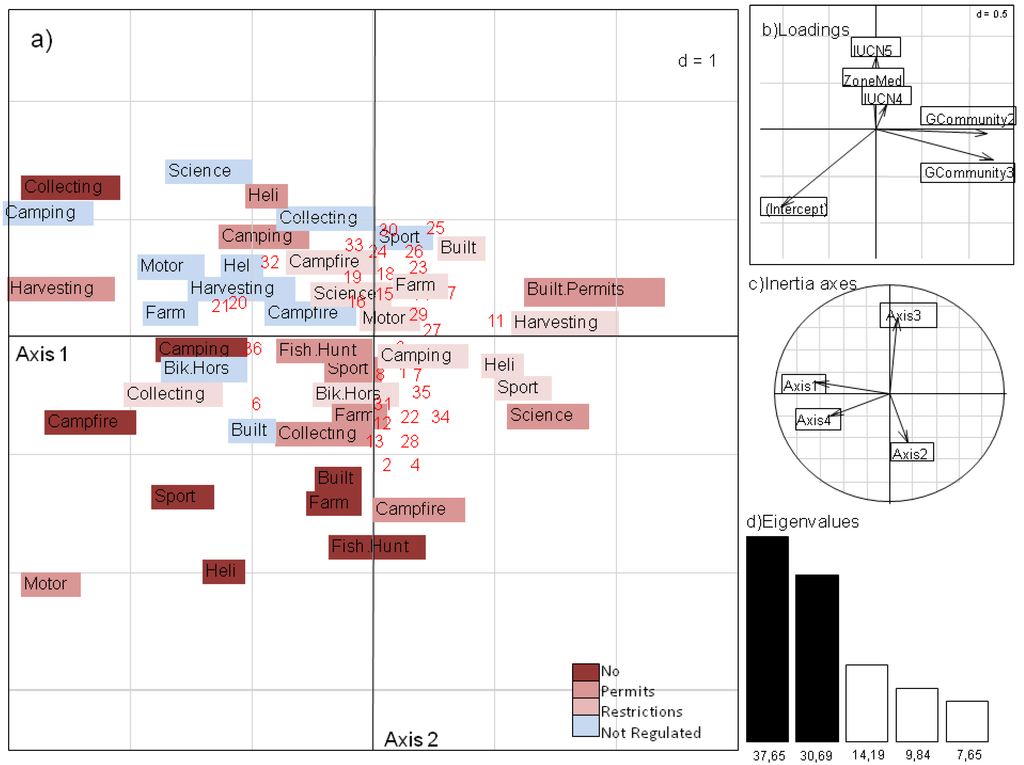 In this paper, we used CAiv to partition the variation in aims and regulations explained by the IUCN categories, vegetation zones and autonomous communities [40]. The main advantage of this method compared to logistic regression or log-linear models is that a linear combination of explanatory variables (i.e., IUCN categories, vegetation zones and autonomous communities) can be used to predict multiple aims and regulations simultaneously. The principal component analysis on instrumental variables (PCAiv) function [43] in the ade4 library package for the R environment [44] permits constrained analyses of the duality diagrams of both numerical and categorical data (see [45]). We used multiple correspondence analysis as the unconstrained analysis to predict the effects of the three explanatory variables on aims and regulations. Multiple correspondence analysis (MCA) is an extended version of correspondence analysis and is suitable for sets of homogenous variables that are closely associated [37,38,39]. We aimed to determine how well the different regulations of human activities are associated with each other, but we were also interested in understanding the relationships in levels of restrictions (e.g., whether typical visitor activities, such as camping and campfires, are allowed in the IUCN categories characterized by the highest level of protection).