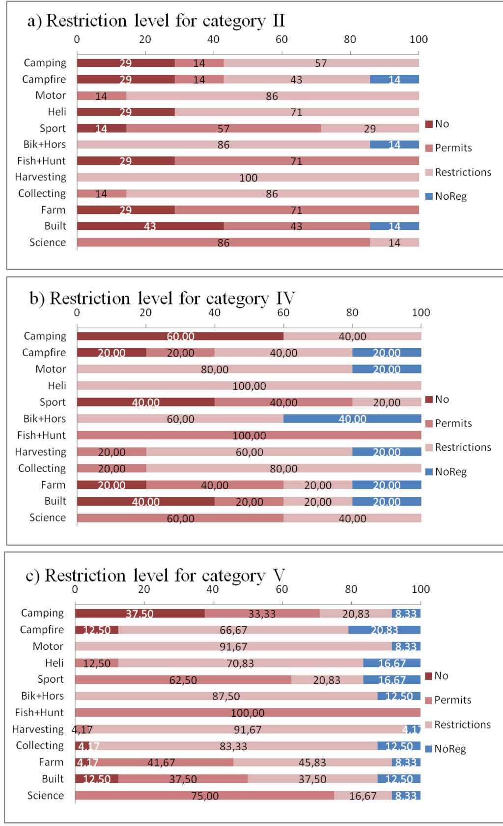 Percentage of the different levels of restriction (“No”, dark red; “Permits”, light red; “Restrictions”, pink; “Not regulated”, blue) for each regulated activity in the IUCN category II, IV and V PAs.