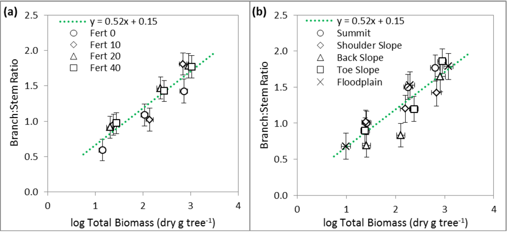 - Coyle, D.R.; Coleman, M.D. Forest production responses to irrigation and fertilization are not explained by shifts in allocation. For. Ecol. Manag. 2005, 208, 137–152. [Google Scholar] [CrossRef]