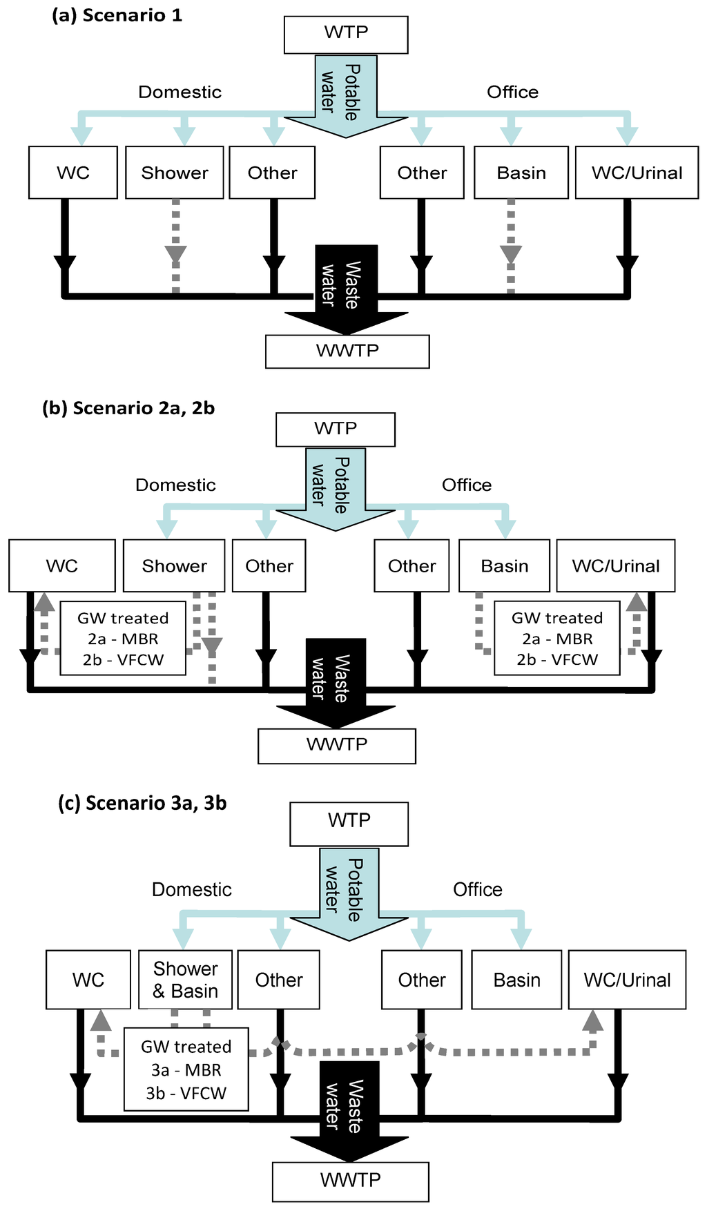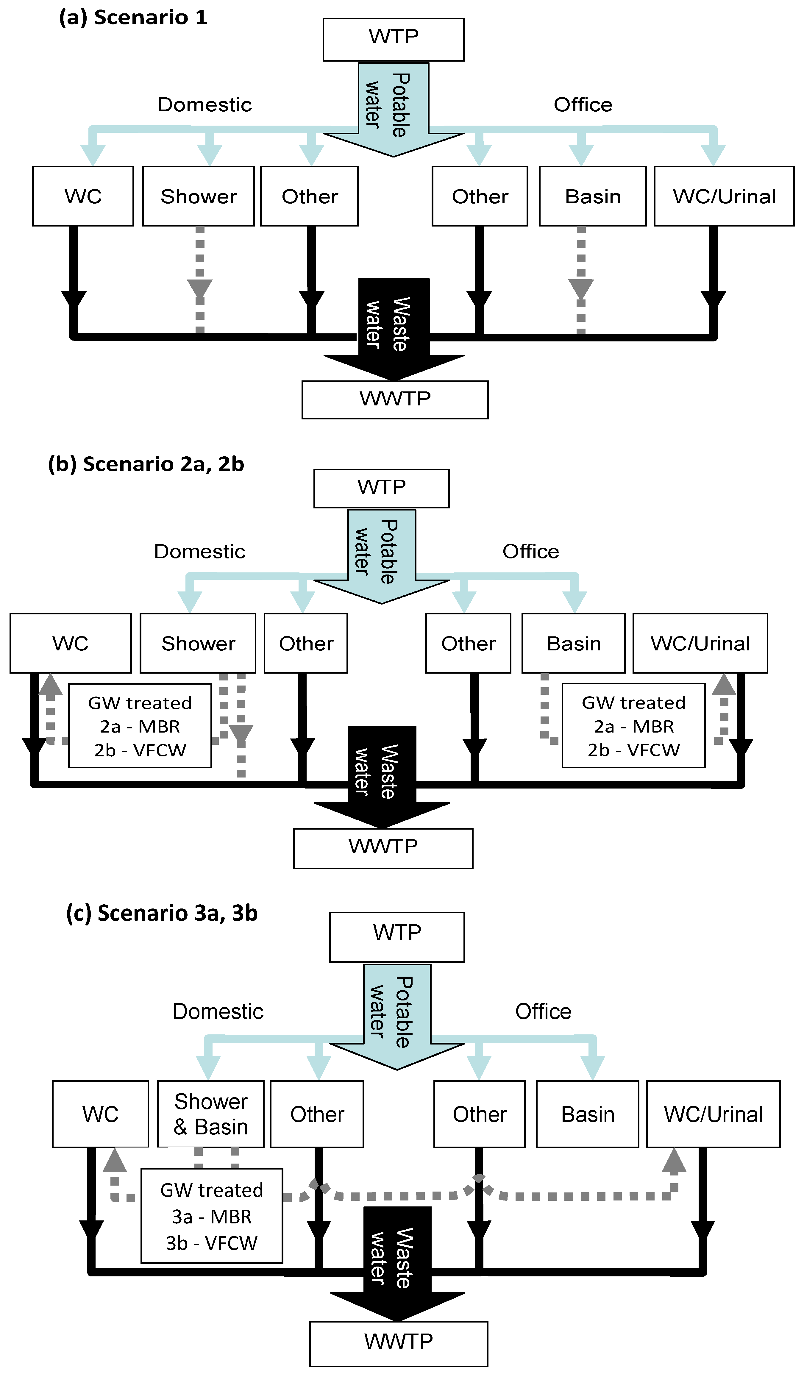 47]. In each case, two tanks are adopted (one before and one after treatment); to level fluctuations in inflow and on the demand side. Filters are included to remove the solid particles, such as hair and skin from the raw greywater, before it enters the treatment systems, either MBR or VFCW; MBR consists of a compact unit, which combines activated sludge treatment for the removal of biodegradable pollutants and a membrane for solid/liquid separation [