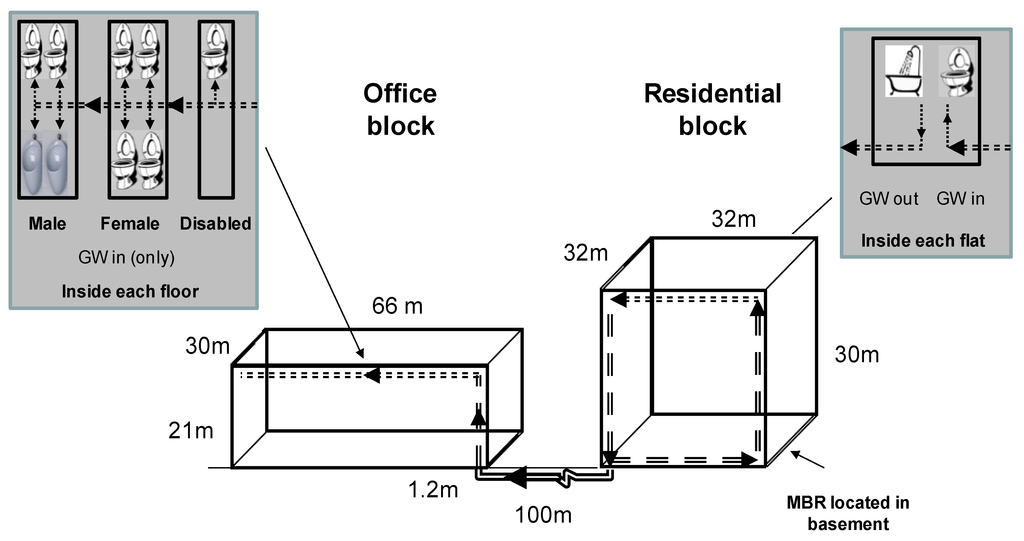 The simulation results from the following water flow module are used to provide quantification of the water saving potential for the mixed-use GW recycling system. The module has two components: annual GW supply (GWS) and annual GW demand (GWD). Equations 1 and 2 are used to calculate the volume of GW supply in residential (GWSR) and office block (GWSO). The GW supply component is contributed to from showering within the residential block and from hand basin(s) within the office block. (Other sub components, e.g., bathing, or washing machines, could be added by the user if so desired, but are not considered here.)