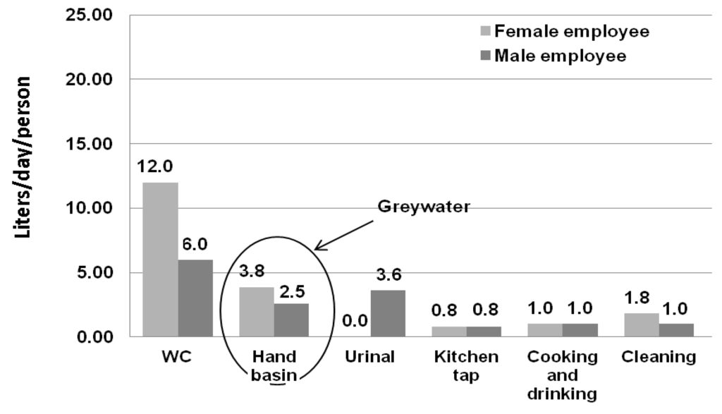 Equation 4 can be used for calculating the toilet flushing demand for female employees without considering the urinal flushing. The net volume of saved water (