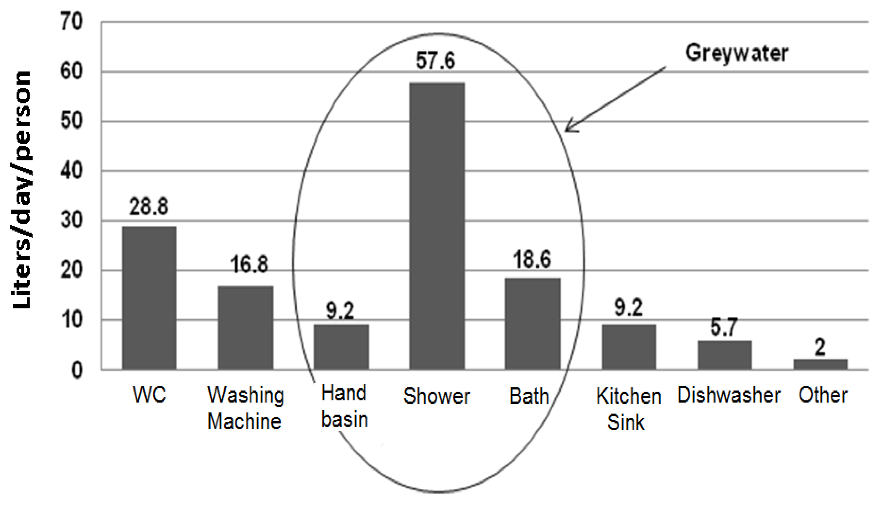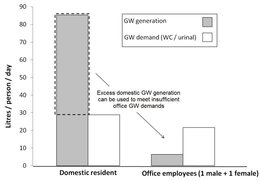 3/day demand for GW represents 94% of the available supply from domestic showers. Whilst this appears to be sufficient, it would likely not meet any additional system losses or significant fluctuations in demand encountered during the day. It is for this reason that GW is collected also from hand basins in residential blocks leading to a total supply of 28.9 m