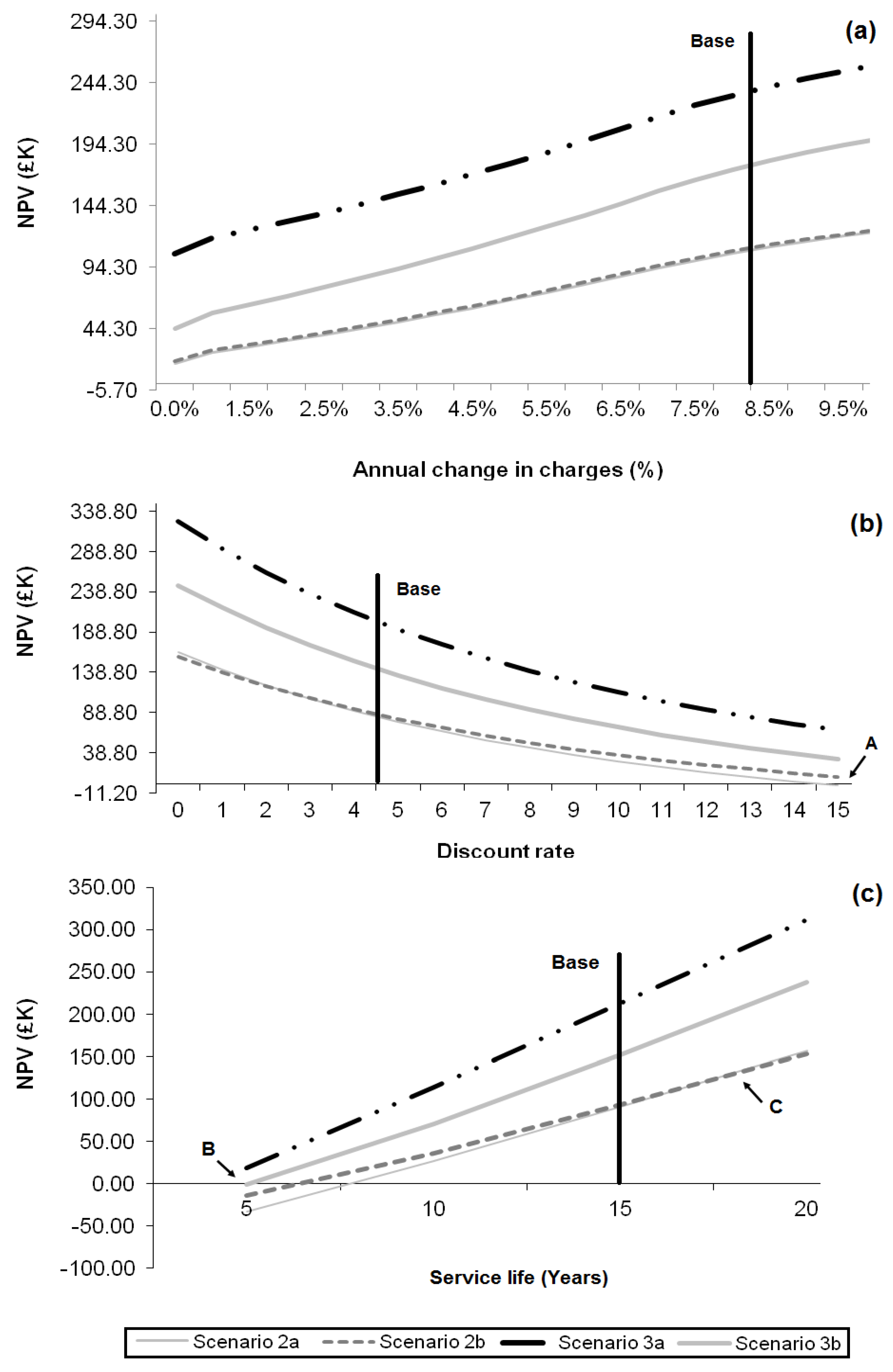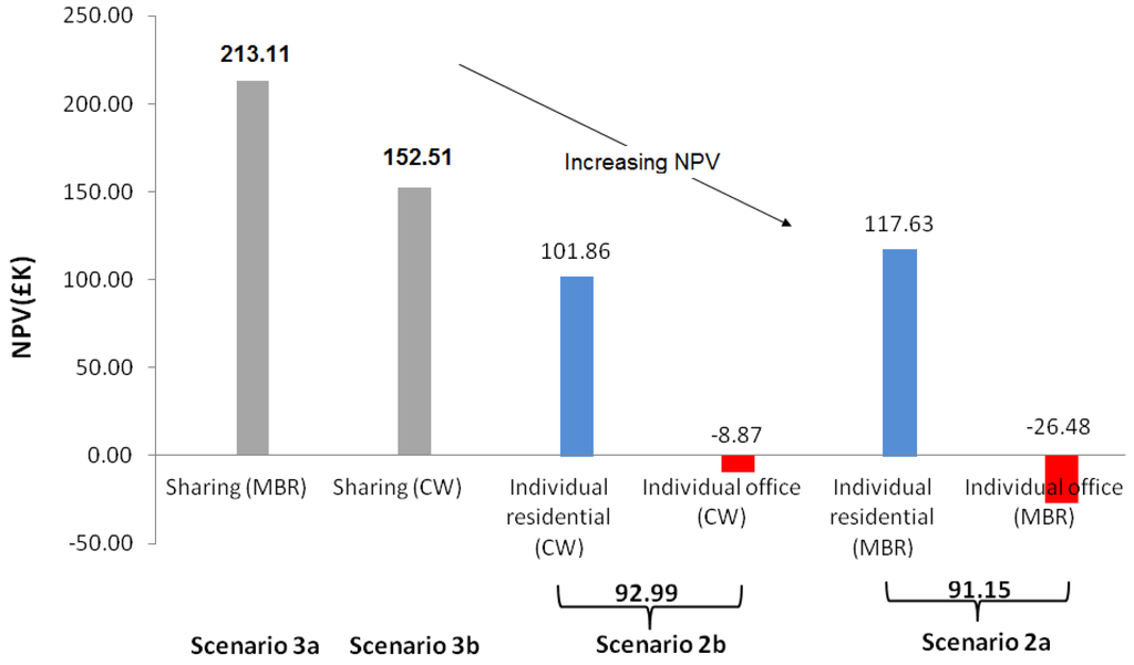 3/day) and costs £74,900 come from Scenario 1, where no GW collection or recycling occurs. The potable mains water demands are reduced by 19% in Scenario 2a and 2b, where GW is sourced from individual buildings. The related costs are reduced by 18%. However, whilst 27.8 m
