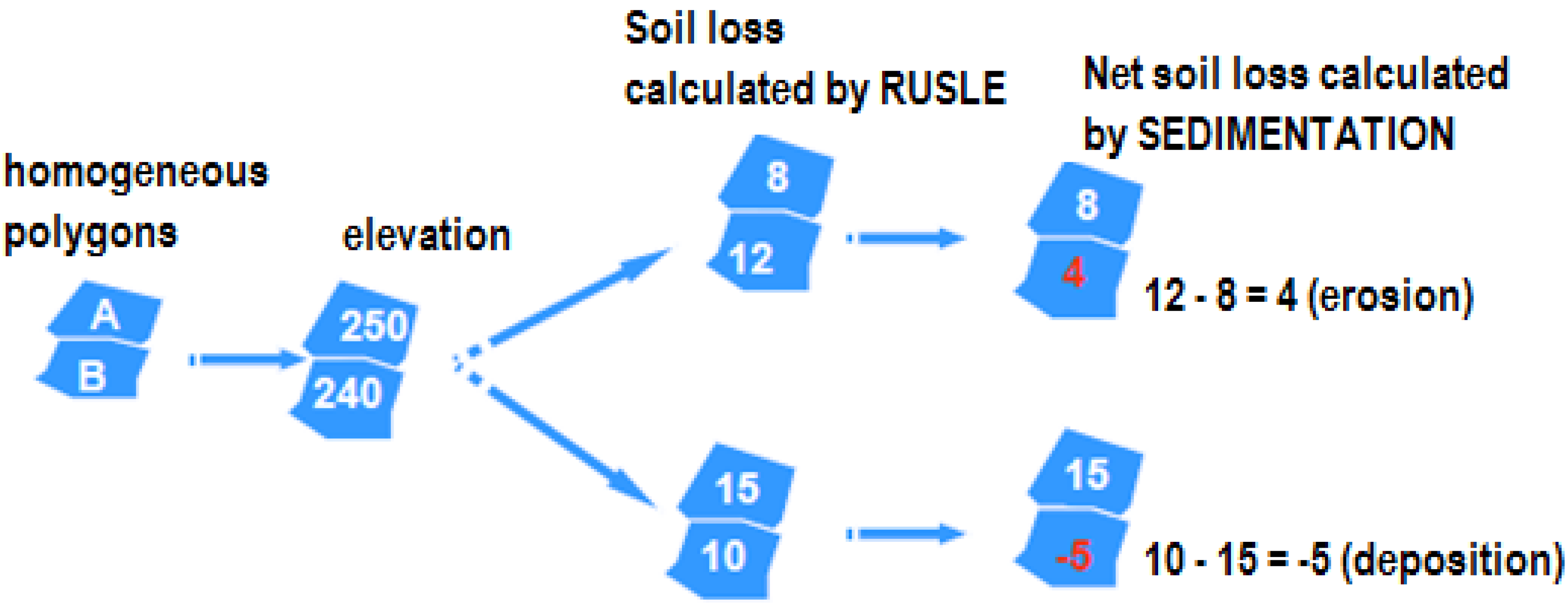 The sedimentation model is based on the results of the RUSLE model to determine the balance of erosion in each elementary patch and evaluate the net movement of soil (erosion or deposition) in sub catchment [39]. One of limitations of the RUSLE model is that its application to any land unit must result in soil loss but it cannot estimate deposition. However, within agricultural areas and river basins, deposition occurs. The down slope movement of soil loss from one field to another is not conceptualized within RUSLE. Net erosion or deposition for a given area is calculated in the following manner when applying the sedimentation model (Figure 3), determination of patch soil loss, establishment of direction of soil movement and calculation of relative soil loss for the higher patch is compared to the soil loss for the lower patch. The difference between the amounts of soil loss from the higher patch to the lower patch represents the net soil loss or deposition in the lower patch. For example in Figure 4, if in the initial state the proportional soil loss in Patch A (the higher patch) delivered to the lower patch B is 8 t/yr, and Patch B’s initial soil loss is 12 t/yr (RUSLE soil loss value), sedimentation then determines the difference between the amount of sediment coming into the patch and the patch’s RUSLE soil loss value.