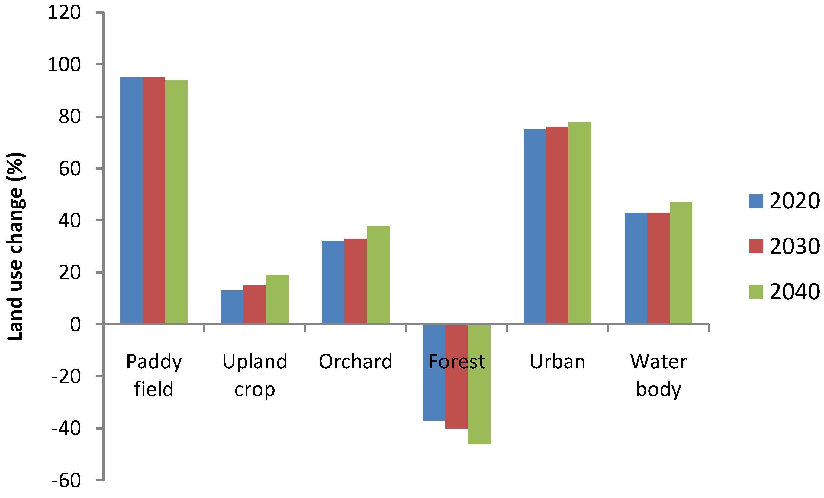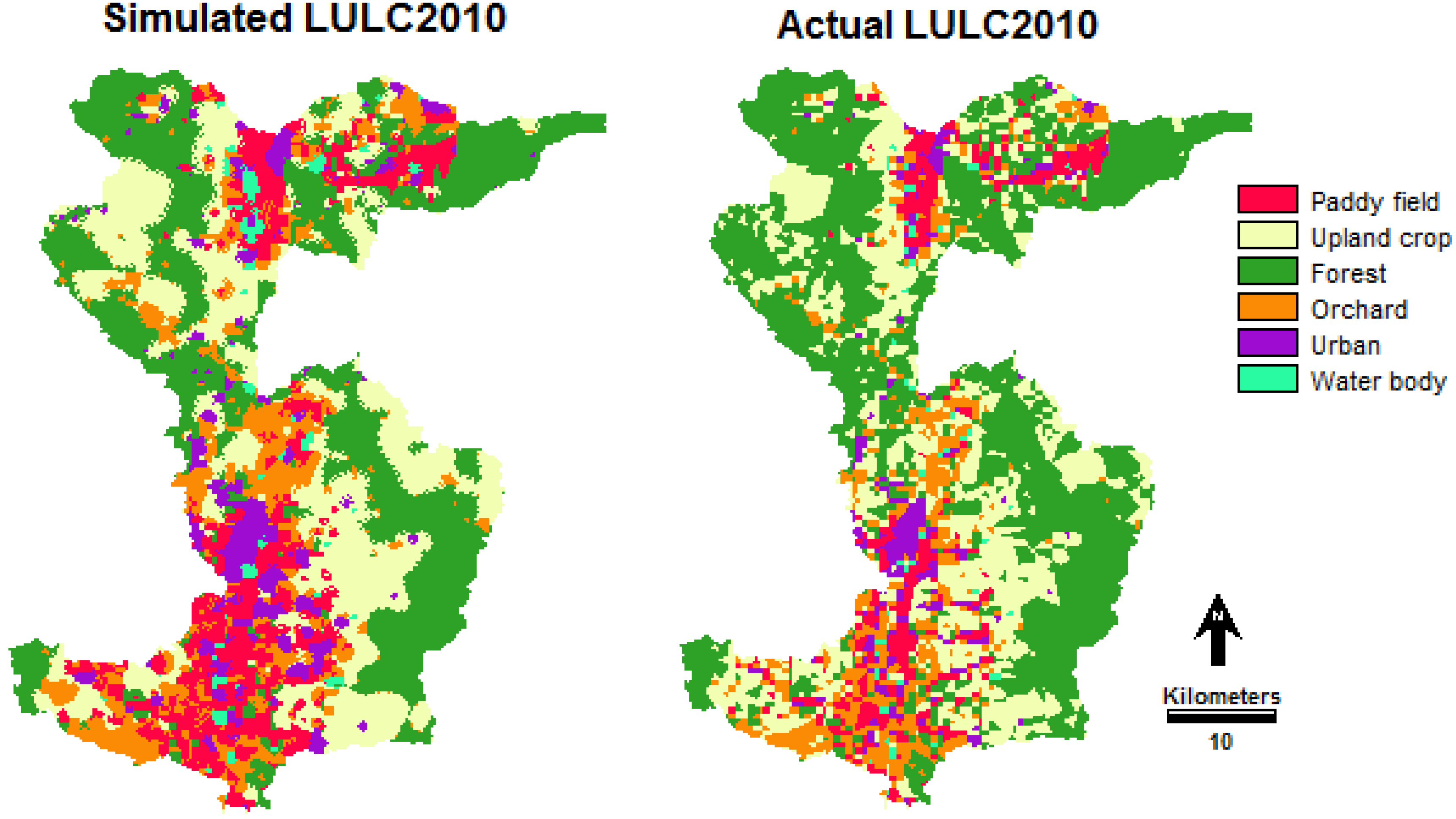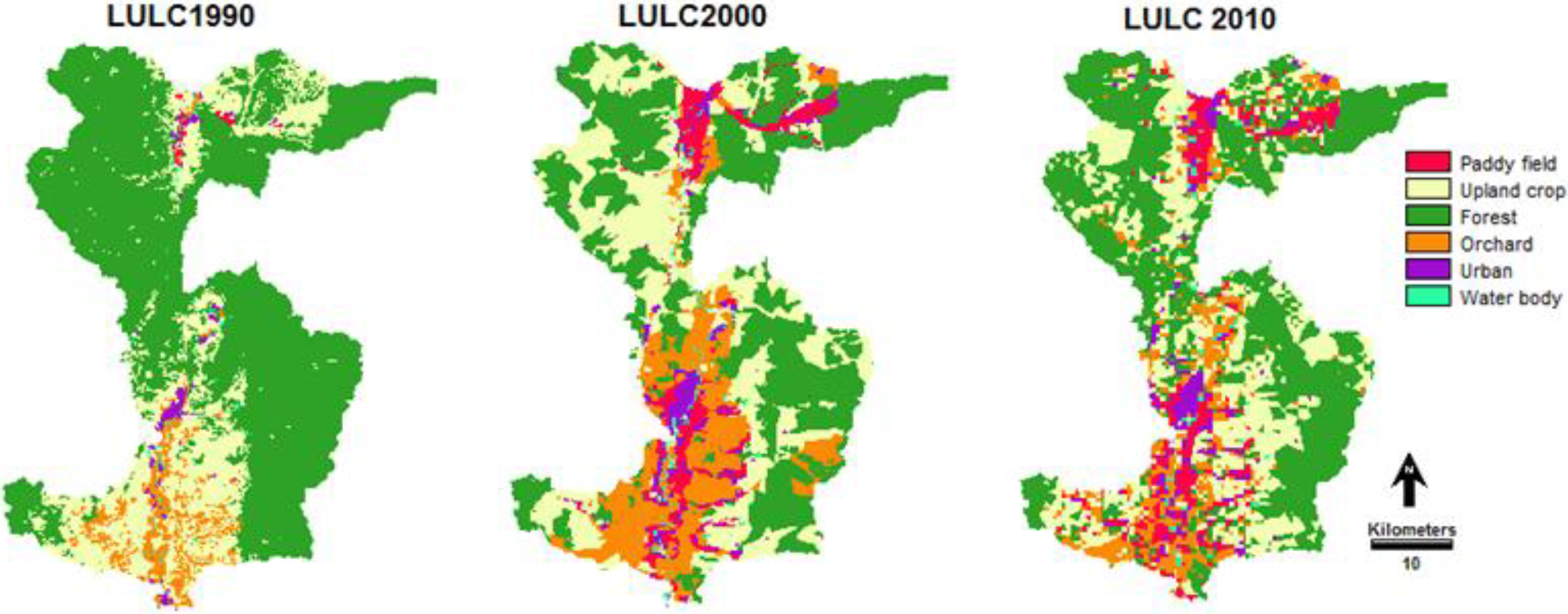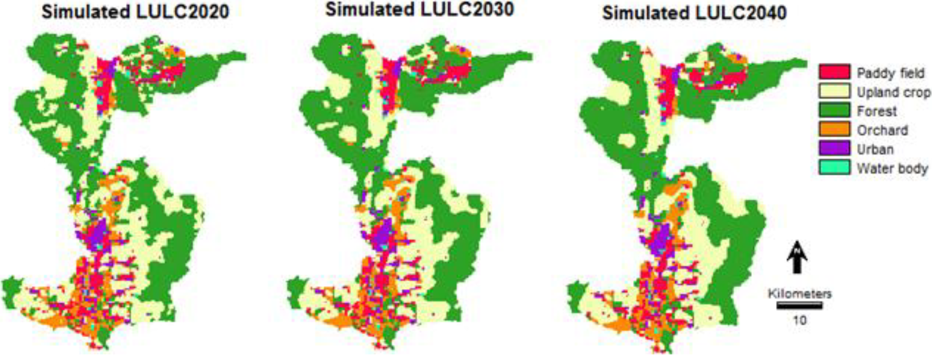 There are several limitations in this paper. A major one is that uncertainties of a range of possible climate change consist of uncertainty surrounding future climate change projections (emissions and GCMs/RCMs) and downscaling methods. The downscaling method (delta change method) also creates uncertainties in downscaled climate data sets in part because GCMs are optimized to forecast climate change at their native resolutions [70]. The delta change method is a simple way to implement and acquire information from just a GCMs/RCM monthly time scale. On the other hand, many statistical downscaling methods need data from just GCMs on a daily time scale. Daily scale data from GCMs are considered less accurate by many [71,72]. Also, bias correction and variance adjustment is often needed to obtain adequate results, whereas with the change factor method, bias correction is implicitly built into the approach [59]. Another limitation of this study is that the CA_Markov mode was the time duration used for the LULC change prediction, although it should be the same time period for the database used in the study. However, this paper studies land use change in the year 2010 derived from the CA_Markov model compared with the results from LULC classification in 2010 by the segmentation classification. Hence the result from the prediction is different from the time duration for the LULC prediction in the years 2020, 2030 and 2040 estimated by the CA_Markov mode (for which the time duration change was 20, 30 and 40 years) and was derived from LULC change for the period of 10 years (from 1990 to 2000).