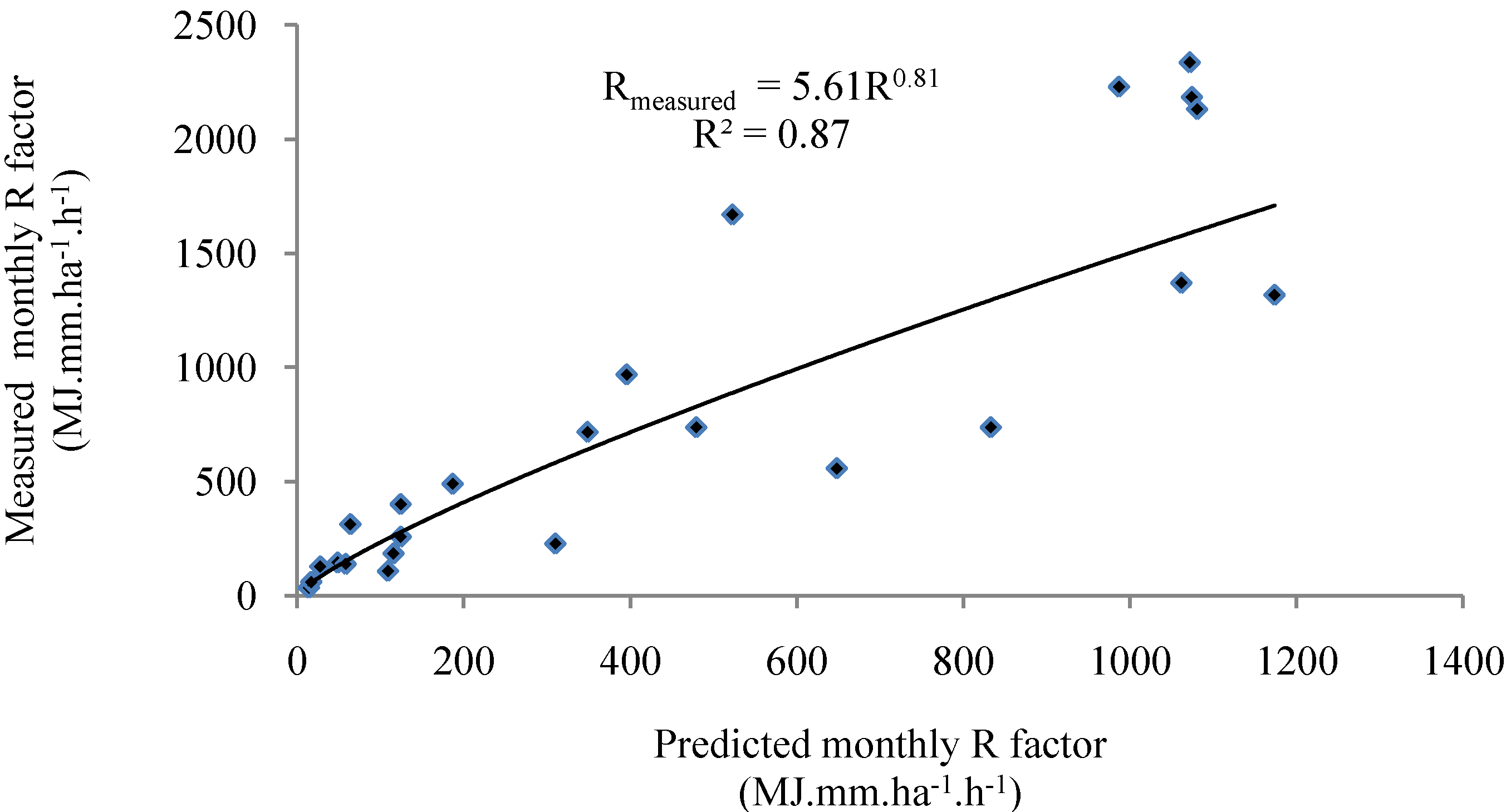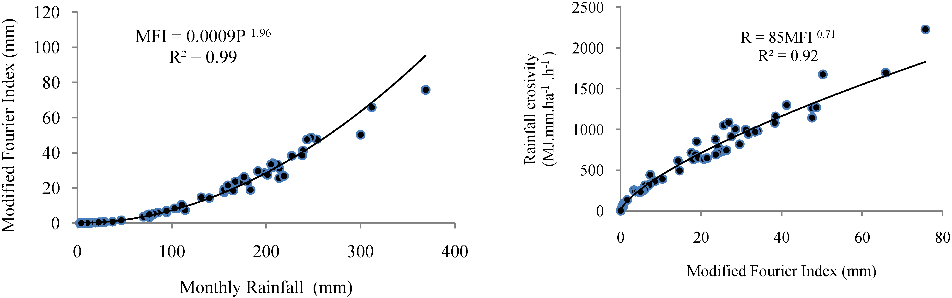 Estimation of the annual rainfall erosivity using the modified Fournier index (MFI) has been proposed when only monthly precipitation data are available [51].