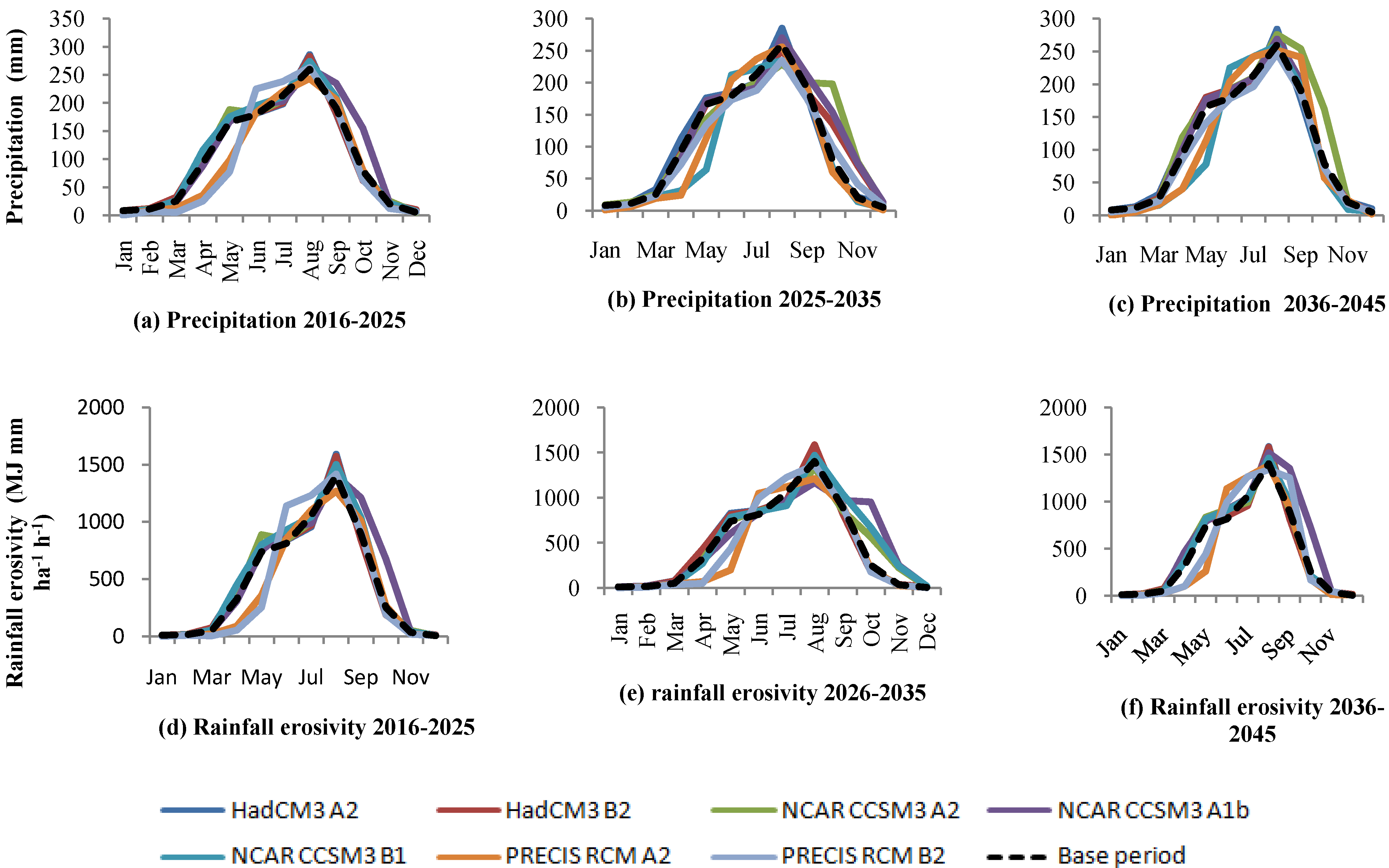 Estimation of future climate change provided by Global Circulation Models (GCMs) and RCM do not provide the type of detailed storm information needed to directly calculate predicted R factor changes. Therefore, statistical relationships between monthly precipitation and modified Fournier index (MFI), and MFI versus rainfall erosivity were used to analyze the GCMs/RCMs outputs relative to R factor changes [53] in order to analyze the spatial distribution of rainfall erosivity under future climate. R factor values were calculated using the method described by Renard (1997) [15]. For the study, the commonly used HadCM3, CCSM3 and PRECIS RCM were chosen to generate the future precipitation scenarios.