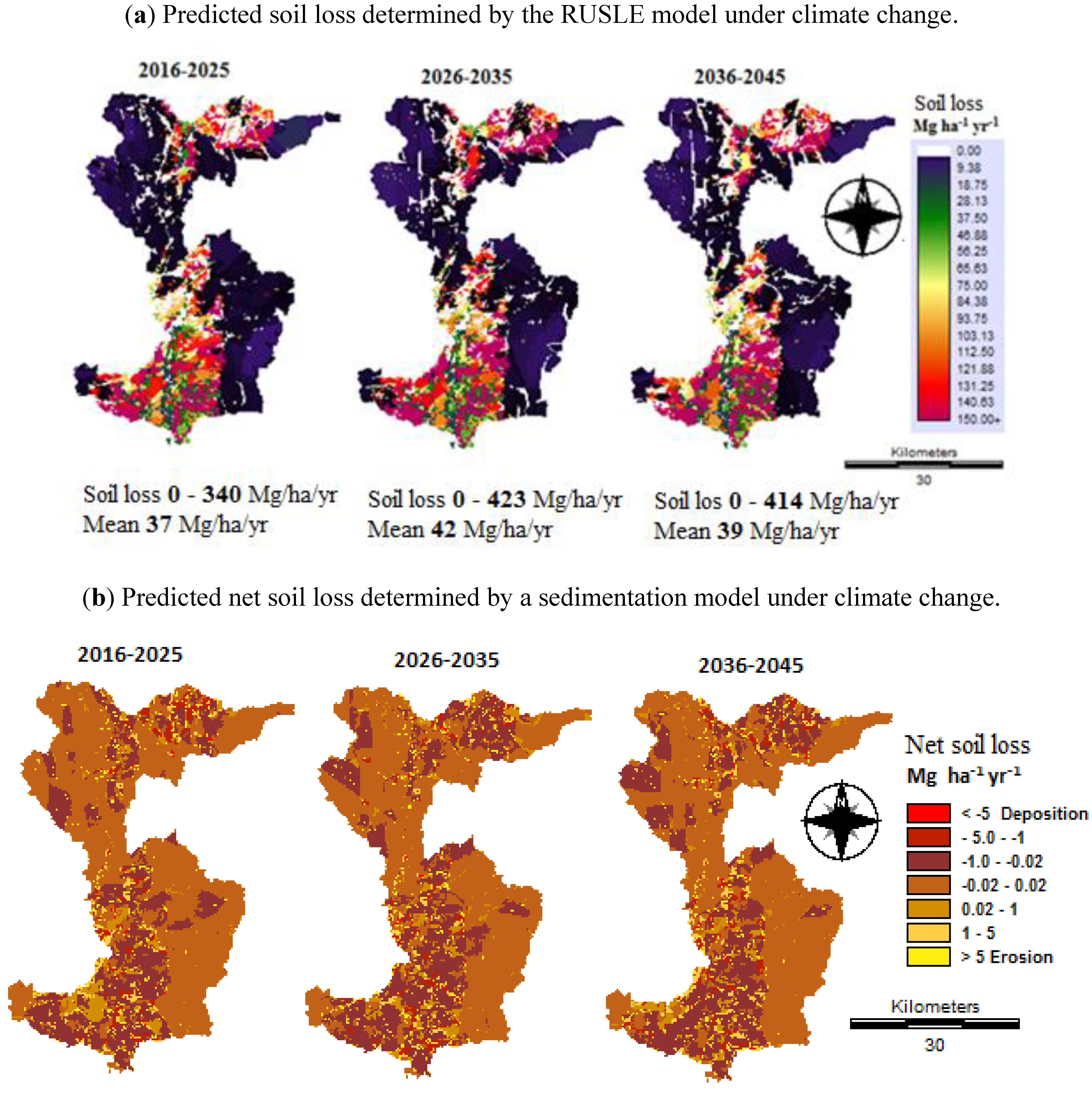 The impacts of climate change on soil loss and net soil loss (erosion and deposition) may increase or decrease at the Mae Nam Nan sub-catchment depending on the interacting effects of the factors considered. It can be seen that the mean soil loss determined by the RUSLE model (Figure 12a) under climate change projections from a combination of HadCM3, CCSM3 and PRECIS RCM with A2, A1b, B2 and B1 emission scenarios for three future time slices are between 37 Mg ha−1 y−1 for 2016–2025 and 42 Mg ha−1 y−1 for 2026–2035. Table 11 shows that there is a increase in net soil loss estimated by sedimentation model, ranging in increases from the base line of 24,037 Mg y−1 of between 31,654 Mg y−1 for 2026–2035 and 34,548 Mg y−1 for 2016–2025. If downscaled climate change projections are considered in isolation, then future rates of soil erosion and deposition are generally projected to rise due to increases in precipitation and rainfall erosivity in the future. This is in accordance with similar studies [7,8,10,12] on soil erosion, which suggest that increased precipitation amounts and intensities will lead to greater rates of erosion. The expected increase in precipitation may have significant effects on soil loss.