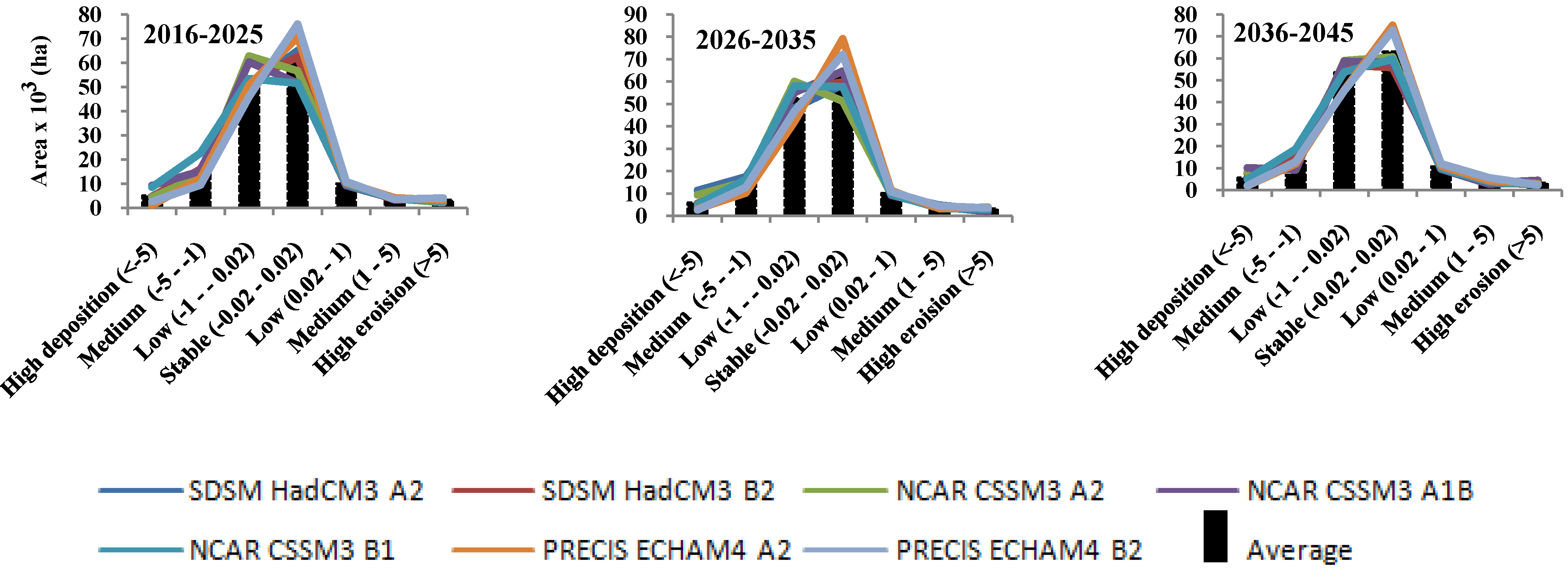 It can be seen that there was a decrease in net soil loss estimated by sedimentation (Table 14) under climate change projections from a combination of HadCM3, CCSM3 and PRECIS RCM with A2, A1b, B2 and B1 emission scenarios for three future time periods from a baseline of 24,037 Mg y−1 of between 11,802 Mg y−1 for 2020 and 17,733 Mg y−1 for 2040. When an additional R factor (climate change) and C factor (land use change) are included in the modeling process, soil erosion rates and net soil loss are projected to decrease dramatically. However, the increase in rainfall can be expected through the increase in the number of rain days and the increase in rainfall intensity. The study conducted by Pruski and Nearing [13] indicates that changes in rainfall that occur due to changes in storm intensity can be expected to have a greater impact on erosion rates than those due to changes in the number of rain days alone. Further studies are necessary to consider the impact of rainfall intensity on potential changes in rainfall erosivity and soil erosion and deposition in the Mea Nam Nan sub-catchment.