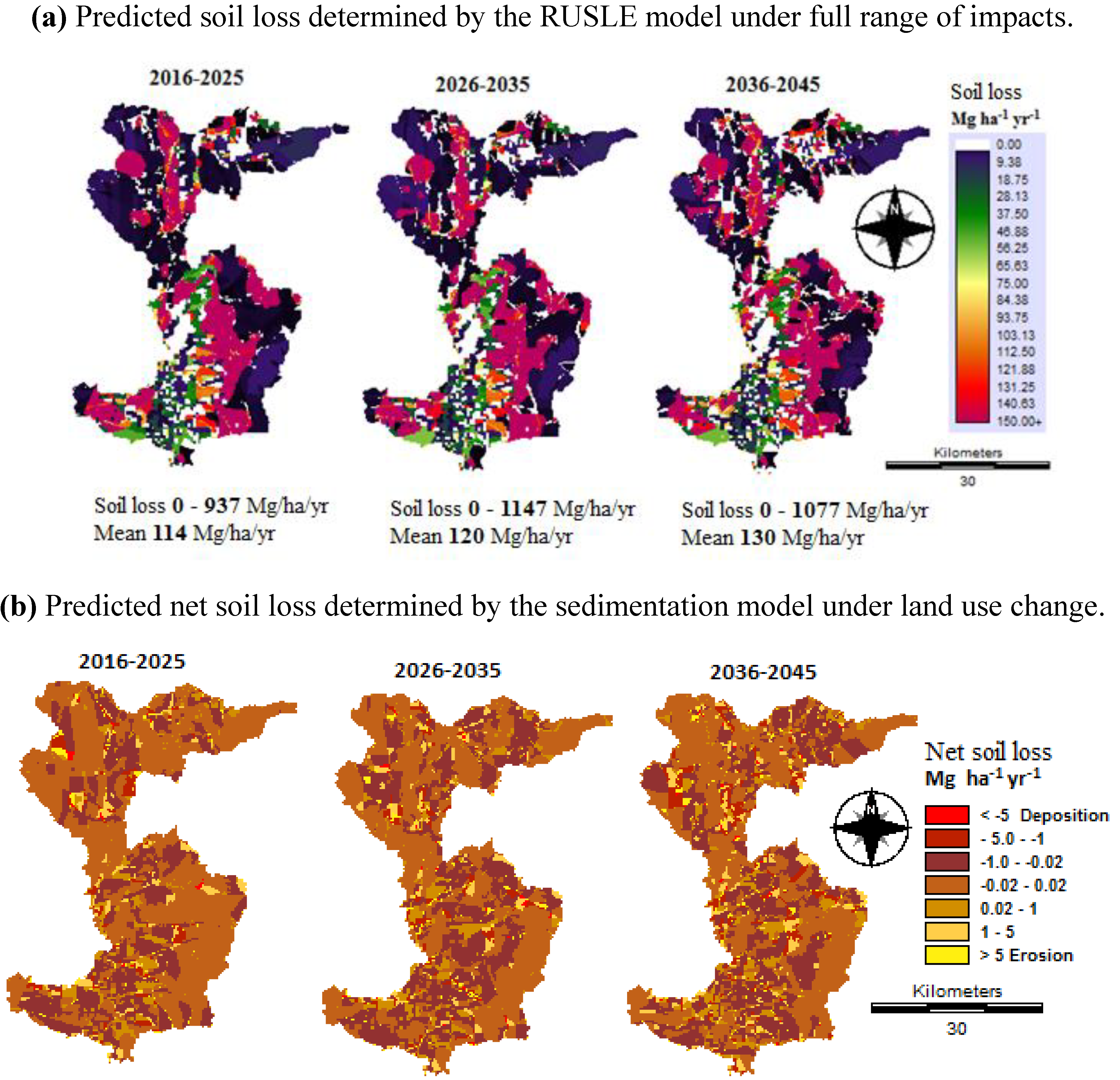 The mean soil loss was determined by the RUSLE model under a land use change between 157 Mg ha−1 y−1 in 2020 and 195 Mg ha−1 y−1 in 2030 (Figure 15a–b). Similarly, net soil losses estimated by the sedimentation model for all three future time periods decrease dramatically from a base line of 24,037 Mg y−1 to 4,639 Mg y−1 for 2020 and 7,733 Mg y−1 for 2040. Land use is the most crucial element in the soil erosion model. Land use change factors are practically the most difficult to predict with confidence. Soil loss and net soil loss potential maps were generated based on the past (1990) and future land use (2020, 2030 and 2040) and other spatially derived parameters using the RUSLE and sedimentation models. When land use change and management are added to the modeling process, however, then soil loss rate, soil erosion and deposition are projected to decrease significantly from the baseline period, depending on the specific land use scenarios. Areas of high erosion can be rapidly identified, and management efforts can be directed at these high priority areas. In this study, high erosion and deposition zones indentified areas along the Nan River. Thus, improved vegetation conditions such as vetiveria grass should be recommended to the farmers in order to reduce soil loss in slope areas. For example, it should be recommended to plant vetiveria grass against the slope and along the riverside to capture sedimentation and to grow it on check-dams, which helps to protect against soil erosion.