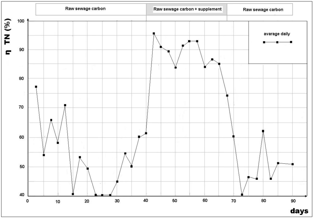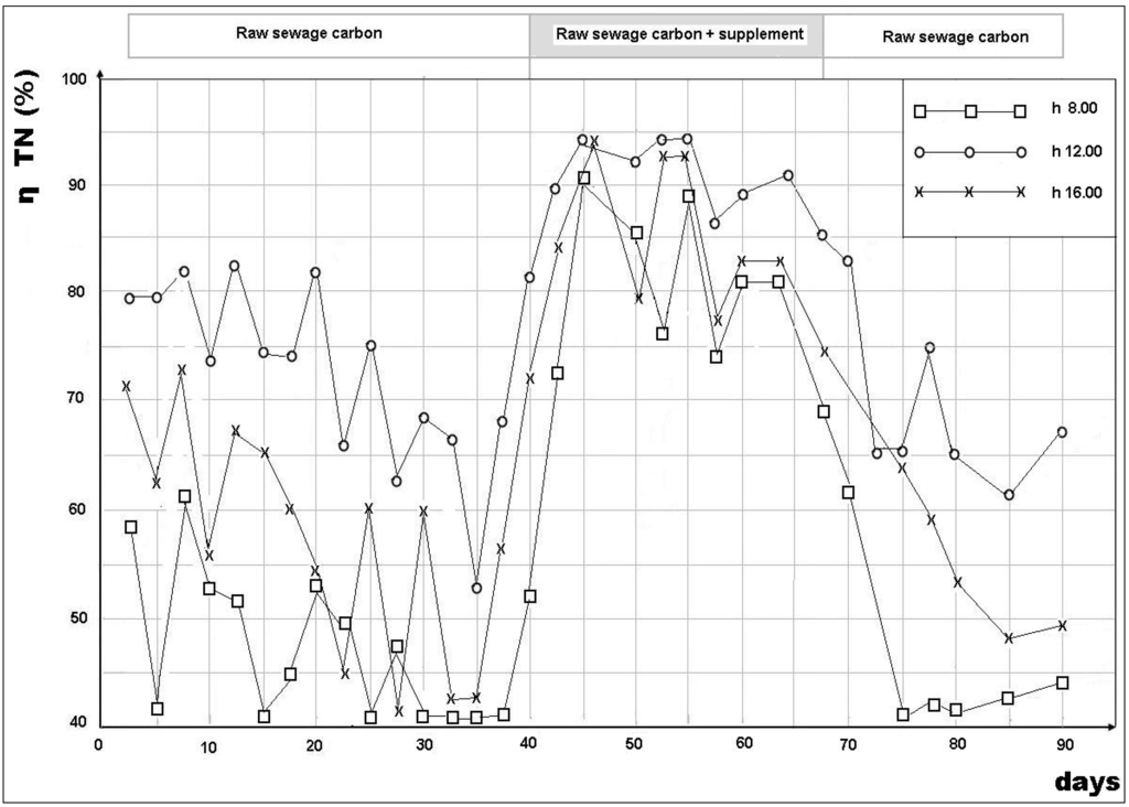 Also in this case, without the supplemental carbon, the trend in the curves appears to be a direct consequence of the BOD5/NO3-N ratio achieved in the denitrification reactor. It clearly shows a low efficiency at 8.00 AM, whereas considerably higher values were achieved at 12.00 AM and at 4.00 PM, which are, however, still insufficient. However, when the supplemental carbon was added, the efficiency rose dramatically, even to values close to 95% (12.00 AM).
