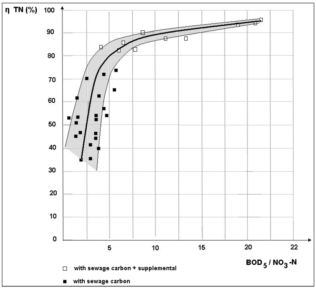 Figure 5 shows the trend in the biological denitrification efficiency as a function of the BOD5/NO3-N ratio with and without the addition of supplemental carbon. The figure clearly shows that it is possible to achieve a stable 90% efficiency (or greater), but only with the addition of supplemental carbon, and, in any case, with BOD5/NO3-N ratios greater than 6. Obviously, the results expressed by this efficiency curve are related to our specific study, and, in particular, to the adverse effects of the great variations in the quality of the raw sewage on the denitrification efficiency.