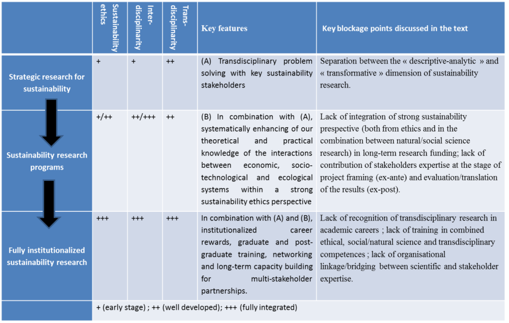 The institutional challenges and barriers considered in this paper add an extra layer of variation to these two main types. Indeed, both strategic research for sustainability and sustainability research are often still constructed on an ad hoc and temporary basis. As such, these two modalities for organizing sustainability research do not consider the long-term institutionalization of sustainability research. The latter implies to address the issues of career rewards, graduate and post-graduate training, networking and long-term capacity building for multi-stakeholder partnerships amongst others. It seems therefore relevant to distinguish between full-fledged institutionalized research programs for sustainability and the other two types. The distinction between the three modalities for organizing sustainability research has been represented schematically in Figure 1.