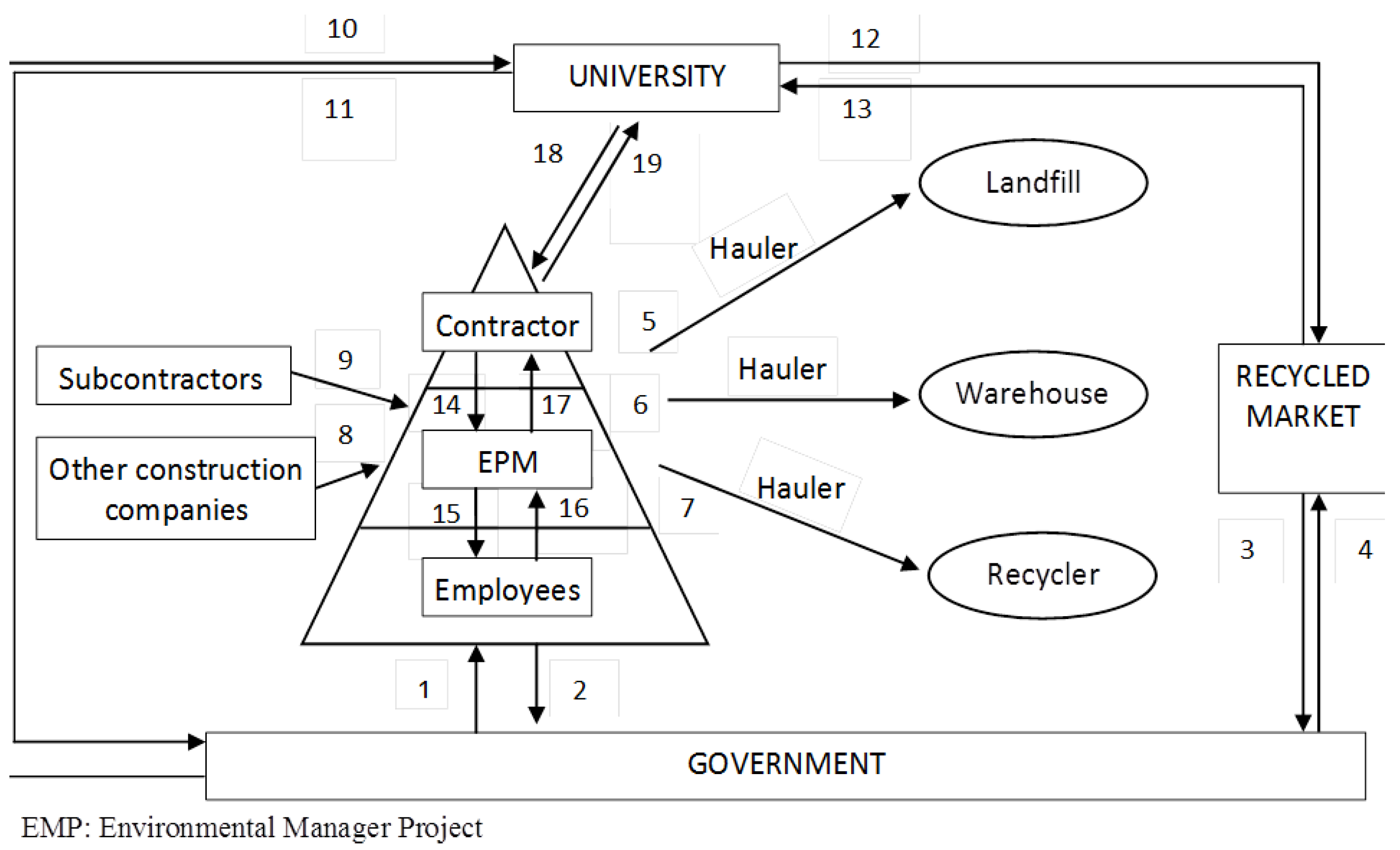 Figure 2 shows a closed loop system from a business management point of view. For the analysis, we have used the work of [3,8]. Our model is based on the relationship between all agents involved in the management of C&D wastes by introducing important views to explore the options for sustainable construction goals. If any of the participants fail in their action, they break the chain leading to successful waste management. Once the cycle is completed, a global environmental culture in the treatment of C&D waste is achieved (Figure 1). The links between agents is represented by means of lines in the system from line 1 to line 19.