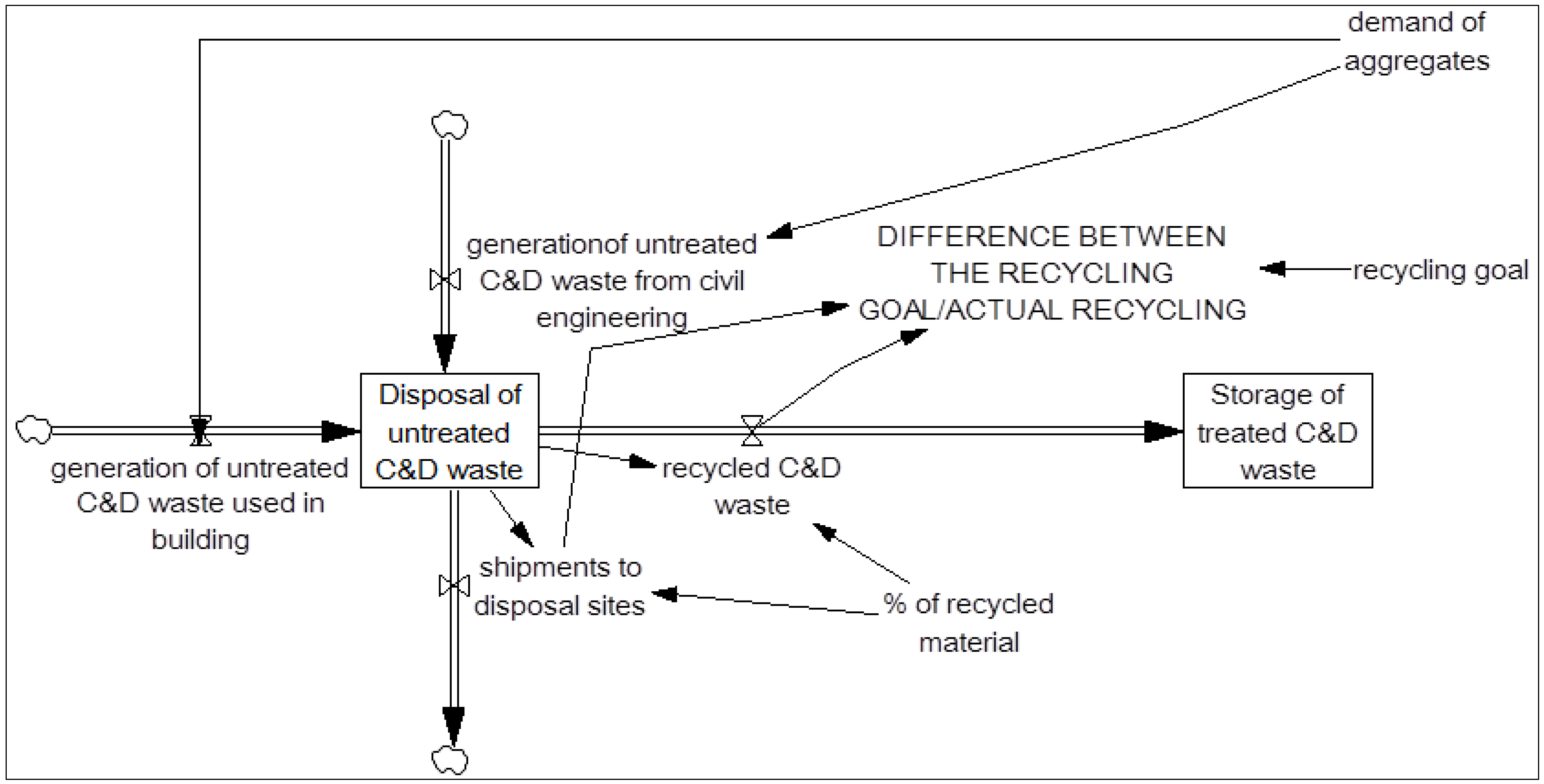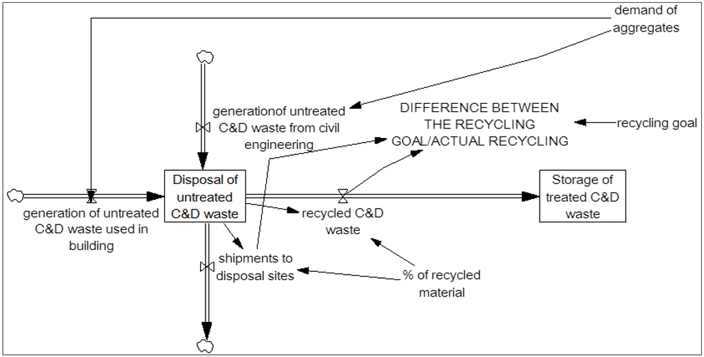 The accumulation of recycled C&D waste (storage of treated C&D waste) will depend on the inflow of recycled materials and on the outflow of these materials as aggregates, to become a part of the materials used in civil engineering works. The amount of inflow of C&D waste will also depend on the percentage of materials that can be transformed into aggregates versus those that are unsuitable for this purpose and are sent to the disposal facility. This distribution is contingent upon the quality of the recycling process (percentage of recycled material), whose percentage can be changed depending on the technology or infrastructure used. The improved quality of recycled materials is directly related to the sustainable construction goal and promotes the development of new technologies to improve efficiency in the procurement and use of recycled materials.