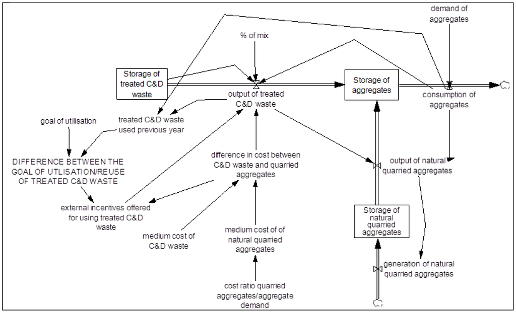 The storage of aggregates will be the result of the sum of the output of treated C&D waste and the output of natural quarried aggregates in each period of time (Figure 4). The institutional policies should aim to balance the total aggregates in favor of the C&D waste instead of natural quarried aggregates. However, it requires a better understanding of the system behavior. Because the final behavior of the firms is an economic behavior, the outflow of C&D waste will depend on the internal and external economic incentives available during construction activity. The decision to substitute a specific proportion of natural quarried aggregates for aggregates made from C&D waste will depend on the relative cost incurred.