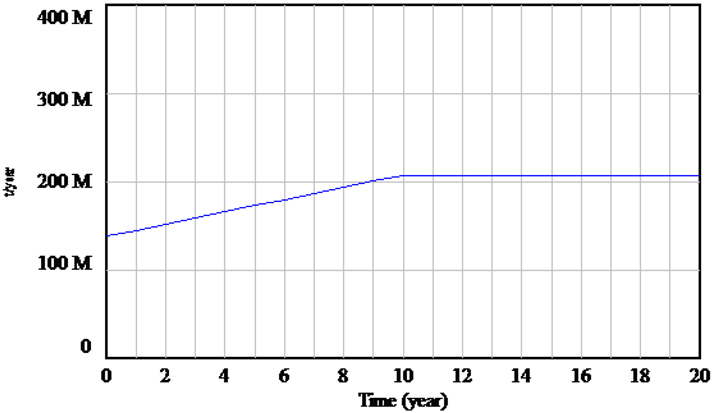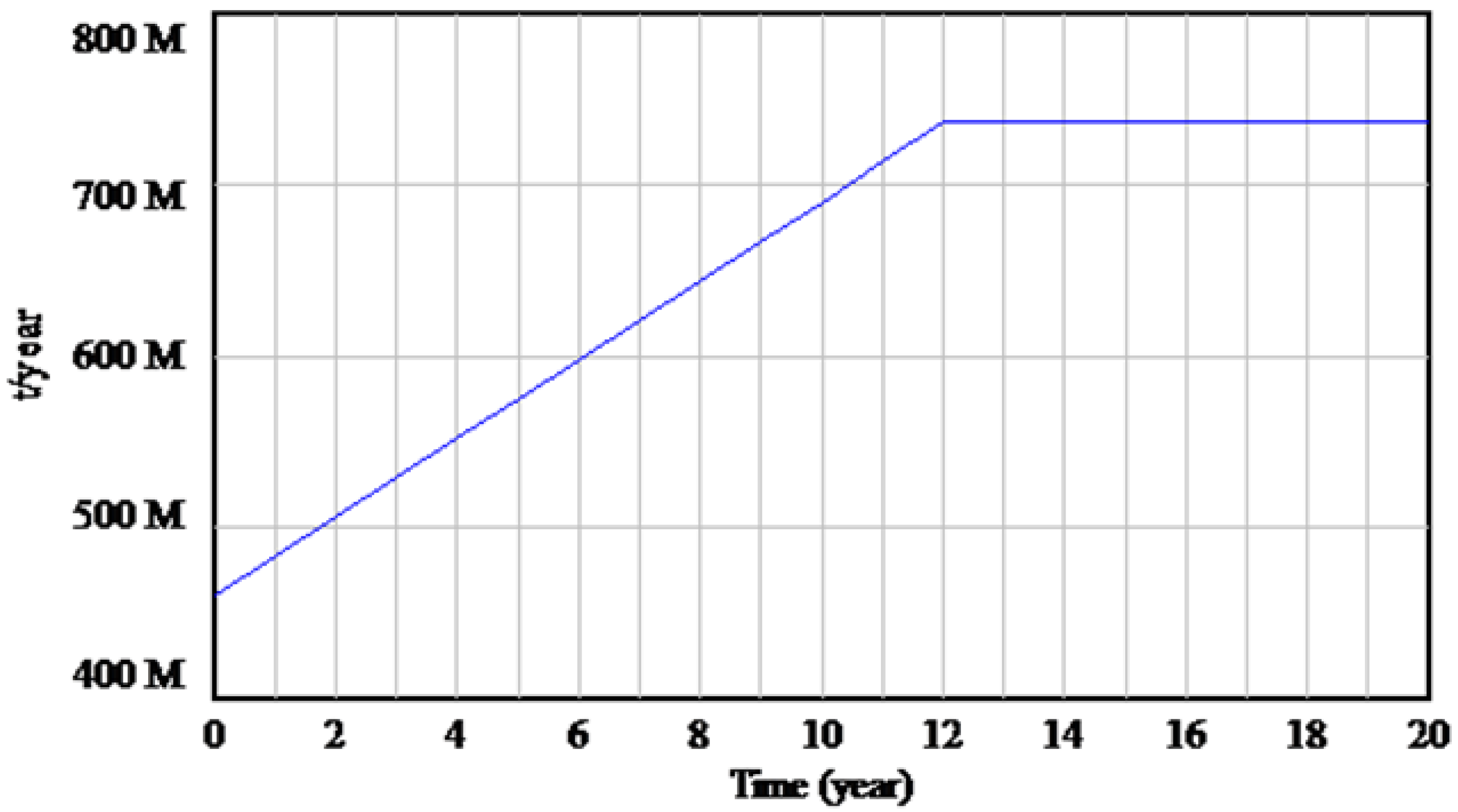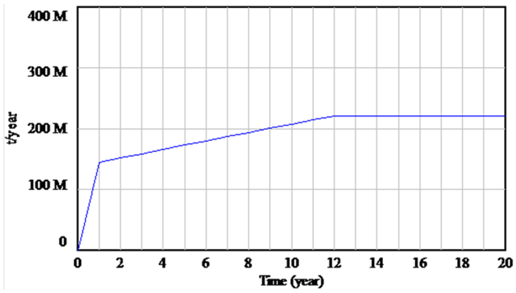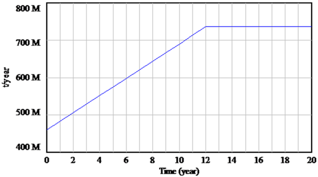 We considered a scenario of demand for aggregates to be used in construction with an initial growth combined with the subsequent period of stagnation (Figure 5). This scenario reflects the historical behavior of these materials over the decade from 2001–2010.