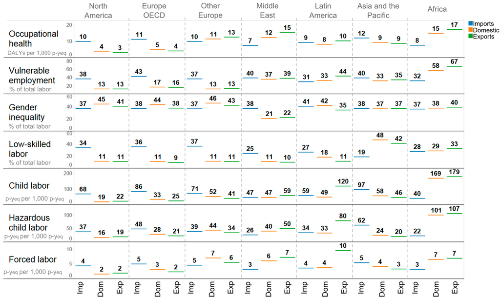 | Child labor | Footprint (1000 p-yeq) | 13,149 | 26,524 | 8,025 | 3,037 | 9,632 | 96,437 | 43,016 |