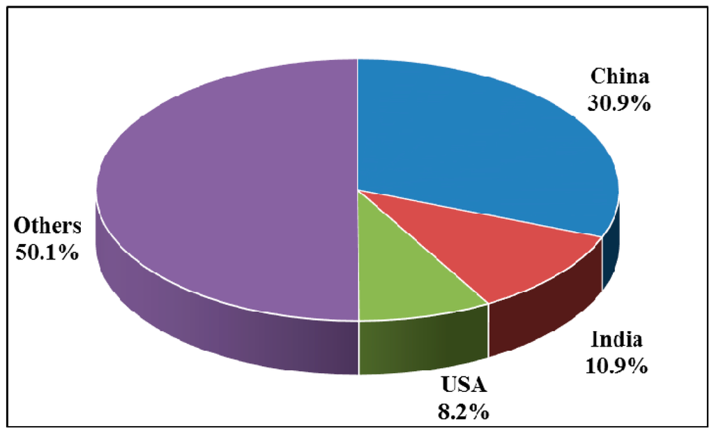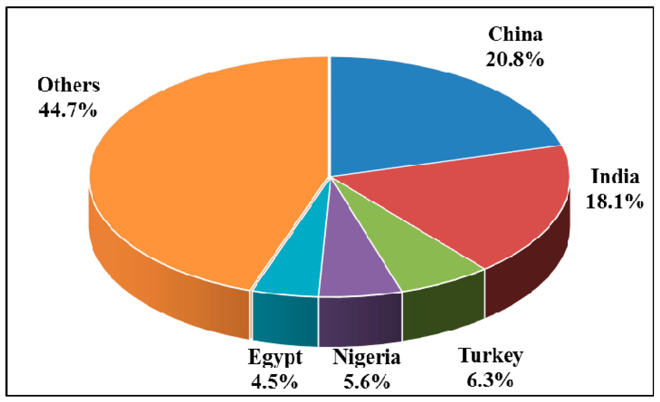Indigenous of Latin America and introduced into Europe at the beginning of sixteenth century, nowadays tomato (Solanum lycopersicum L.) is one of the most widely grown vegetables in the world [1,2]. According to the latest available data, in 2012, tomato area in the world amounted to 4.8 million hectares, denoting, during the last ten years (2012–2003), an increase of 17.3% [3]. This increase was due essentially to the African (+34.9%) and Asian (+30.8%) continents, which in 2012, represented, respectively, 21.0% and 58.8% of world tomato areas, while Europe (−23.8%) and America (−11.6%) denoted a significant decrease with respect to 2003. In the last few years, in fact, tomato is cultivated, increasingly, in new-producer countries to the detriment of the traditional growing areas. This occurs, firstly, due to the low costs of human labor and for the continuous investments that, in recent years, have affected, not only cultivation techniques, but also commercial and marketing strategies, improving the tomato supply chain management [4,5]. China (1,000,000 ha) and India (870,000 ha) represented the two main producer countries, covering 38.9% of world tomato area, followed by Turkey (6.3%), Nigeria (5.6%), and Egypt (4.5%). With regards to world tomato production, in the last ten years, it increased by 35.4%, reaching a value of 161.8 million tons in 2012. China, in addition to growing area, was the top country for harvested quantities (50.0 million tons), followed by India (17.5 million tons) and the USA (13.2 million tons); these three countries reached 49.9% of the total world tomato production (Figure 1 and Figure 2).