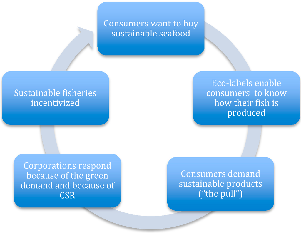 This model is based on the following logic, as depicted in Figure 1. First, there are consumers who are aware and care about the environment and want to buy “sustainable” or “environmentally responsible” goods. Second, these consumers have clear information about the goods they are buying. Third, a label or mark, such as an eco-label, provides a clear signal of environmental sustainability that enables consumers to demonstrate demand for these products in the marketplace. Fourth, the more consumers that purchase an eco-labelled product, the more collective demand or “pull” is created for retailers to provide such products. Fifth, the “pull” from retailers to buy certified sustainable product incentivizes fishermen to modify their practices to be more sustainable.