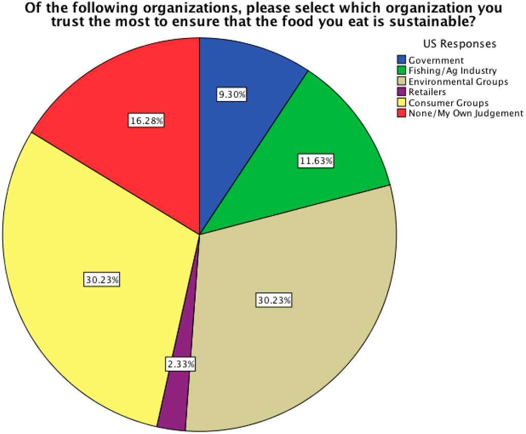Consumers surveyed here clearly relate sustainability to environmental responsibility and recognize that being sustainable takes some action on their part, often through their act of consuming/purchasing goods. This supports the first assumption of the idealized model that a segment of consumers want to buy sustainable products. However, it’s not clear that eco-labels or environmental claims by themselves enable consumers to understand how their seafood is produced sustainably. Apart from the dolphin-safe label, the other labels cover multiple fisheries from around the world and grant certification based on different criteria.