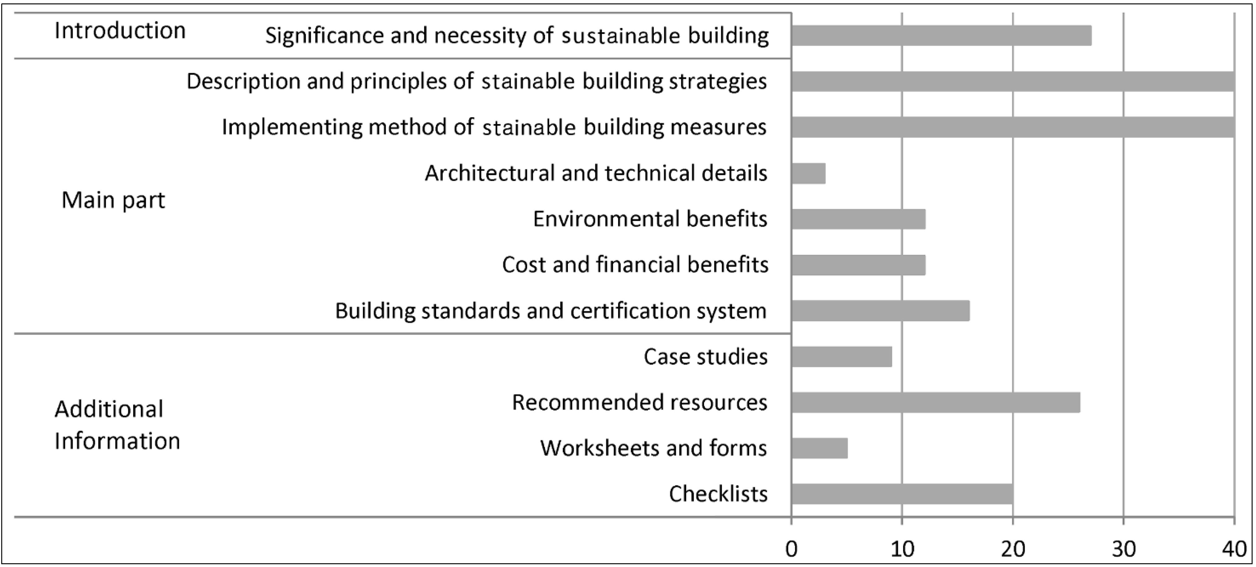 The guidelines should meet the diverse information needs of users, from general information about sustainable building to more technical issues. In general, the introductory part of a guideline not only provides an overview of its purpose, format, and application but also addresses the significance and necessity of sustainable buildings. The main sections of most guidelines provide detailed information and useful practices that can be readily introduced into new construction and renovation projects through description and basic principles of sustainable building strategies, implementation methods of sustainable building measures, architectural and technical details, environmental benefits, cost and financial benefits, as well as building standards and certification systems. Furthermore, additional supporting information was also included, usually in appendices such as case studies, recommended resources, worksheets and forms, and checklists. Figure 1 shows the total number of occurrences by the information type.