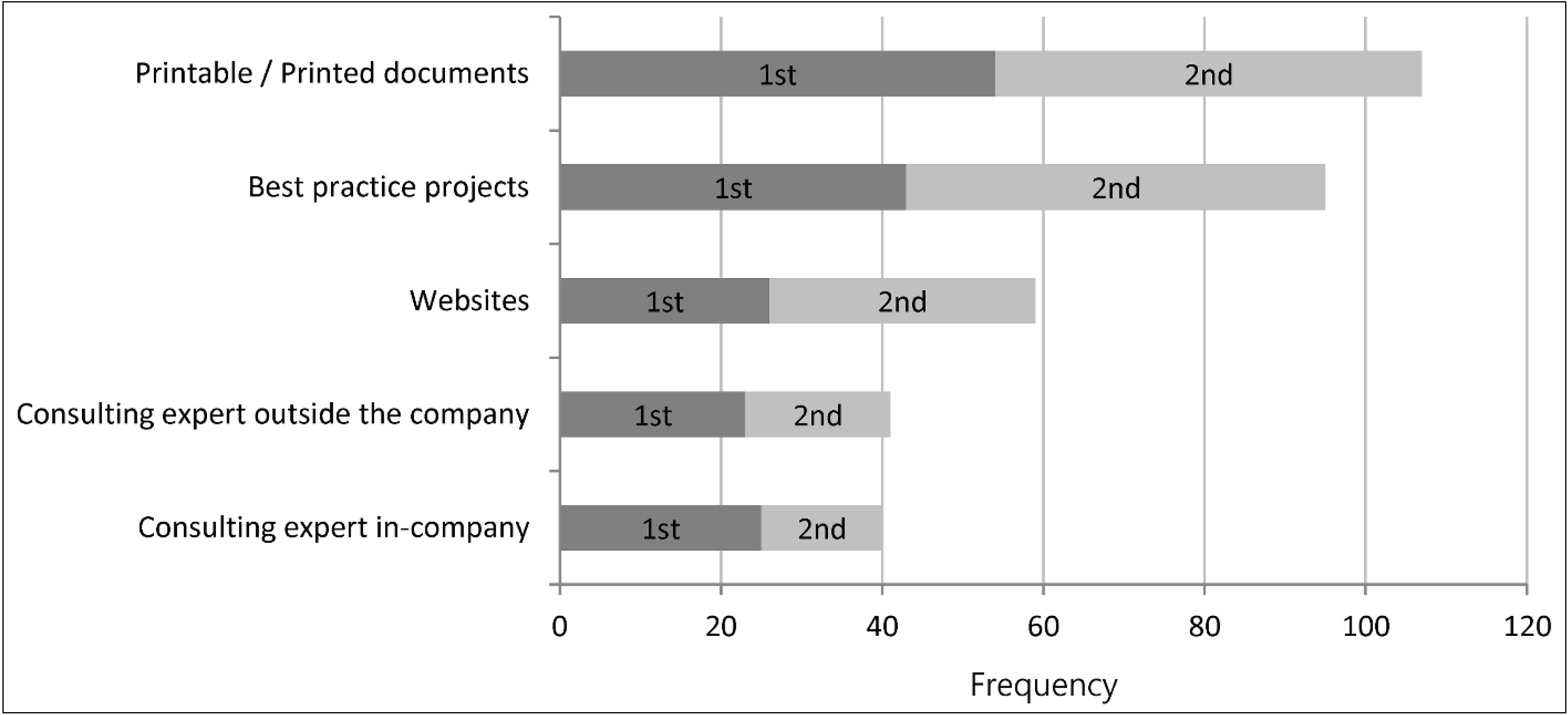 Table 4 shows the ranking of each information type based on their mean ranking, which was established by placing the type with the highest rank first, and that with the lowest rank sixth. Unlike its lower ranking as the respondents’ first choice, “cost and financial benefits” was found to be the most important information type to be included in guidelines. “Implementation method of sustainable building measures” came in second, equal to the result in the first choice. “Description and principles of sustainable building strategies” was ranked as the third most important information type. The reason why its rank (according to the ranking mean) was lower than in the first choice seems to be that it was also valued highest (25%) as their last choice, as shown in Figure 7.