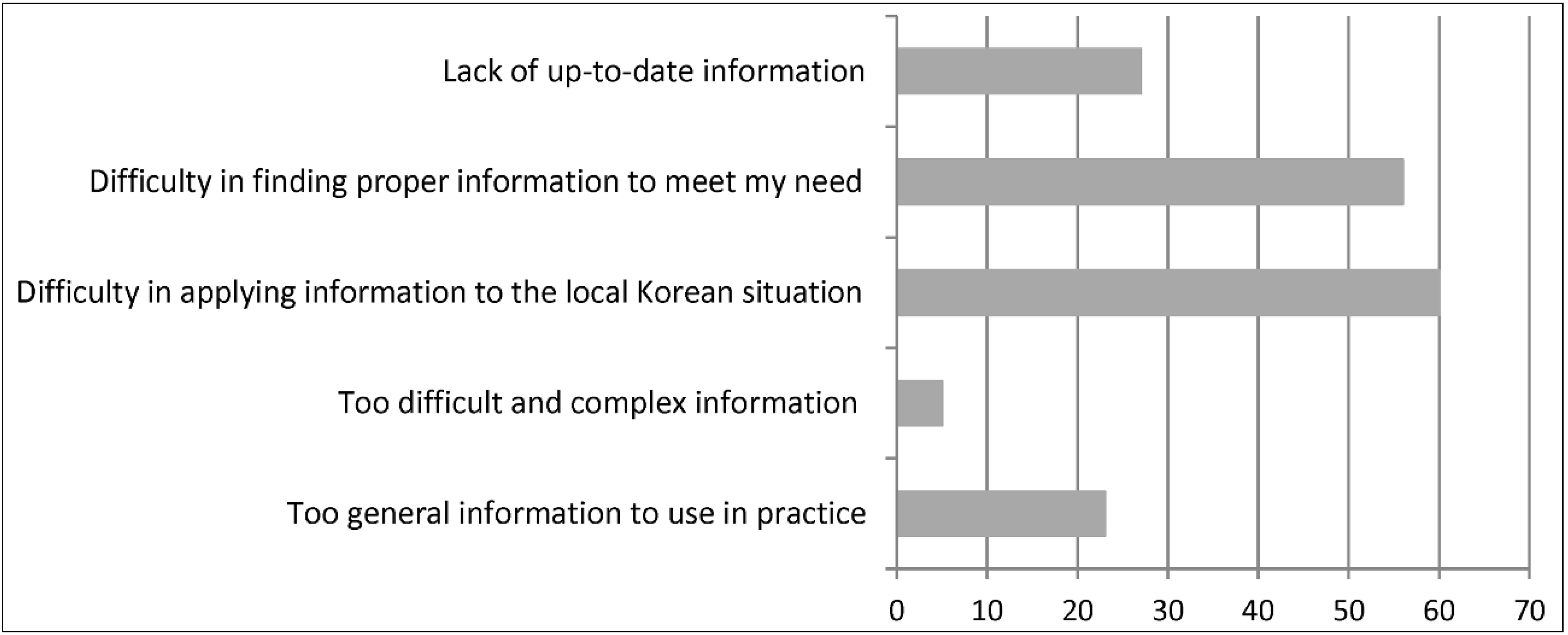 The next question was intended to examine the reasons behind the perceived inconvenience of using current information sources. Respondents were asked to choose the largest source of inconvenience from the list of options shown in Figure 4. The five reasons in the list were established through interviews with building professionals in the pilot study [33]. As depicted in Figure 4, the questionnaire results revealed that “difficulty in applying information to the local Korean situation” (35.1%) and “difficulty in finding proper information to meet my need” (32.7%) were considered to be the main barriers. On the other hand, most respondents seem to have had less difficulty understanding information provided by the sources. The results demonstrated that in developing sustainable building guidelines, it is very important to consider carefully how the latest up-to-date technologies or successful foreign sustainable building practices can be adapted to suit Korean national and regional climatic conditions, codes and regulations, social and cultural contexts, and technology levels. The guidelines should also be designed to provide decision support in the sustainable building design process.