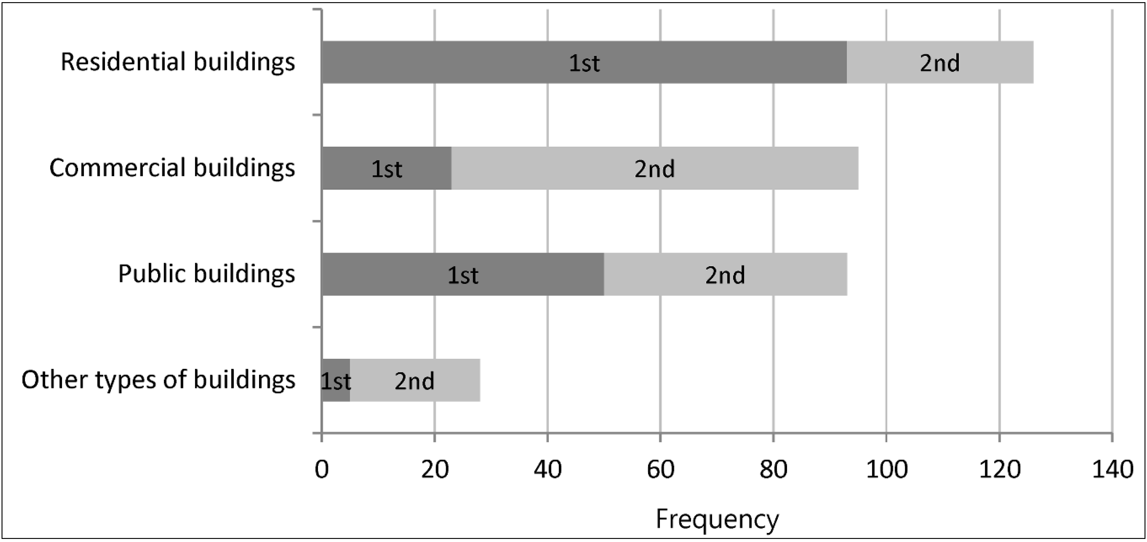 As the second question for this part of the questionnaire, respondents were asked to select and rank, in order of necessity, two target building types among residential buildings, commercial buildings, public buildings, and other types of buildings. Additional space was included at the end of this question to provide specifications on the “other types of buildings”. As shown in Figure 5, there seems to be an urgent need for new guidelines for residential buildings, followed by commercial buildings, and public buildings. Respondents ranked public buildings (29.2%) higher than commercial buildings (13.5%) as their first choice. However, commercial buildings were valued highest (42.1%) as their second choice. In total, 28% of respondents answered the combination of “residential buildings” as the first choice and “commercial buildings” as the second choice. In response to the open-ended question for the “other types of buildings”, most respondents (93%) indicated that a guideline for “educational buildings” is necessary.