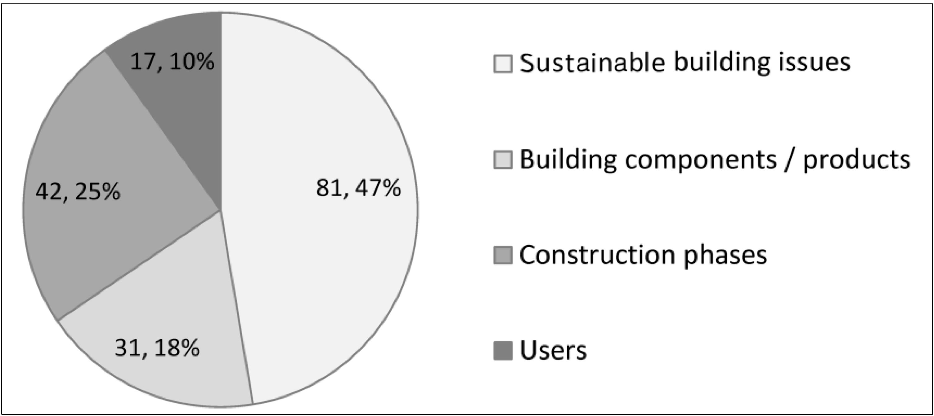 Sustainable building guidelines cover different construction phases, and take different issues and measures into account. Guidelines are also used by a variety of groups, including building owners and building professionals (architects, engineers, and constructors). A well-designed information hierarchy is very important to guide users through the content according to importance and need. Therefore, we examined how the guidelines were organized into parts and sections. Table 2 shows the criteria used for categorizing the content of guidelines. In 60% of the guidelines, main chapters were arranged according to the “sustainable building issues”, and then the content was categorized into sub-chapters according to “detailed measures”. In 33% of cases, main chapters and sub-chapters were divided according to “building components/products” and “detailed measures”, respectively. There were also cases where the chapters were organized in the following ways: “construction phases” (main chapters) and “detailed measures” (sub-chapters); “construction phases” (main chapters) and “building components/products” (sub-chapters); and finally, “users” (main chapters) and “building components/products” (sub-chapters). There was no case in which “detailed measures” was selected as the criteria for dividing main chapters.