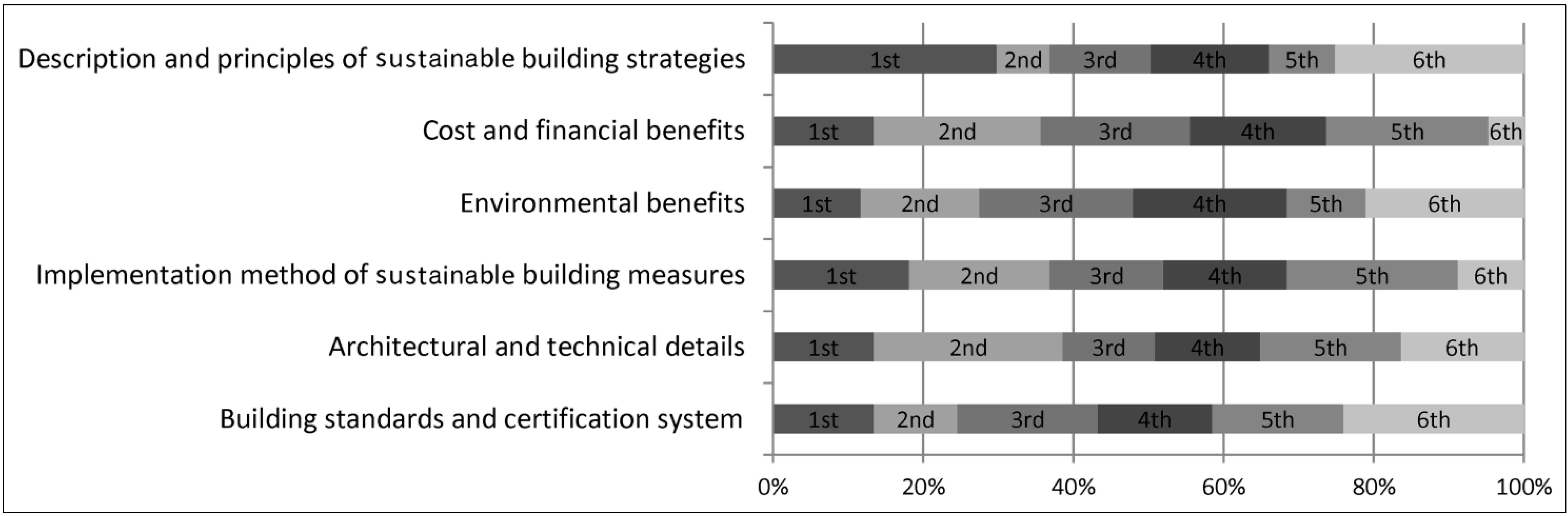 Existing guidelines include various information types, as shown in Figure 1. Respondents were asked to rank, in order of importance, the information types to be included in the main part of the guidelines. Figure 7 shows the rankings of six information types. “Description and principles of sustainable building strategies” was valued highest, having been selected by 29.8% of the respondents as their first choice, followed by “implementing method of sustainable building measures” (18.1%). “Architectural and technical details”, “cost and financial benefits”, and “building standards and certification system” were valued by the same percentage of respondents (13.5%) as their first choice, while “environmental benefits” was ranked lowest by 11.5% of respondents.