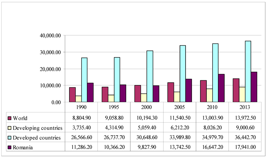 GDP per capita based on purchasing power parity is gross domestic product converted to international dollars using purchasing power parity rates. An international dollar has the same purchasing power over GDP as the US dollar has in the United States. Data in Figure 1 are in constant 2011 international dollars. They show an upward trend of GDP per capita since 1990 to the present. Romania has a GDP of 17,941 I$ per capita, higher than the world average of 13,972 I$. In the World Bank classifications, Romania ranks 11th out of 27 countries in upper middle income class (Economist Intelligence Unit [22] (p. 15).
