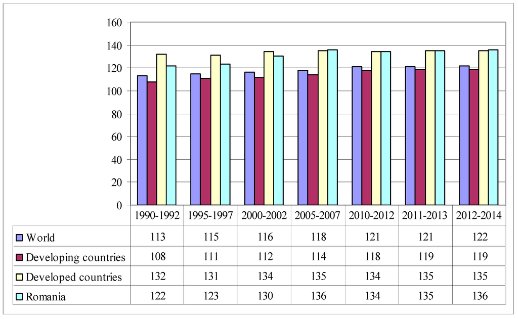 Data in Figure 2 express the Dietary Energy Supply as a percentage of the Average Dietary Energy Requirements in each country. Each country’s or region’s average supply of calories for food consumption is normalized by the average dietary energy requirement estimated for its population, to provide an index of adequacy of the food supply in terms of calories. It can be noticed that in Romania, worldwide, in developed and developing countries, the dietary energy supply is above the average dietary energy requirements. Dietary energy supply in Romania exceeds the requirements with 36%.