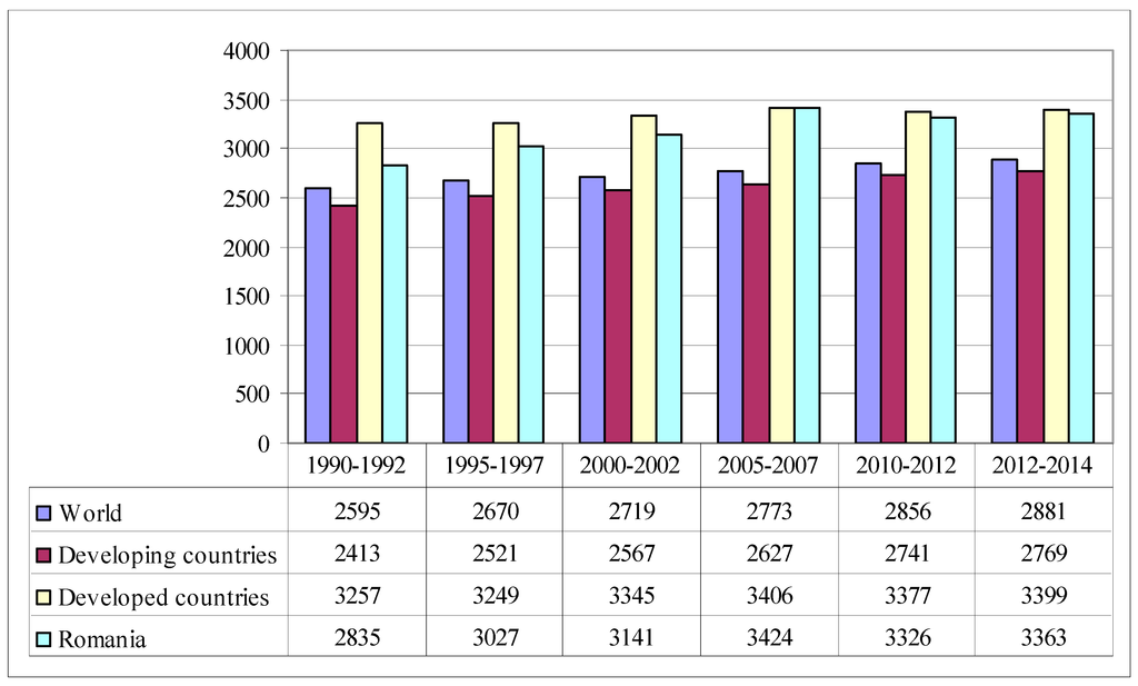 The dietary energy supply in Romania is higher than the average level of indicator “dietary energy requirements worldwide”: 3363 kcal per person per day compared to 2353 kcal/person/day (FAO database). FAO considers that the latter indicator (dietary energy requirements worldwide) is a proper normative reference for adequate nutrition in the population
