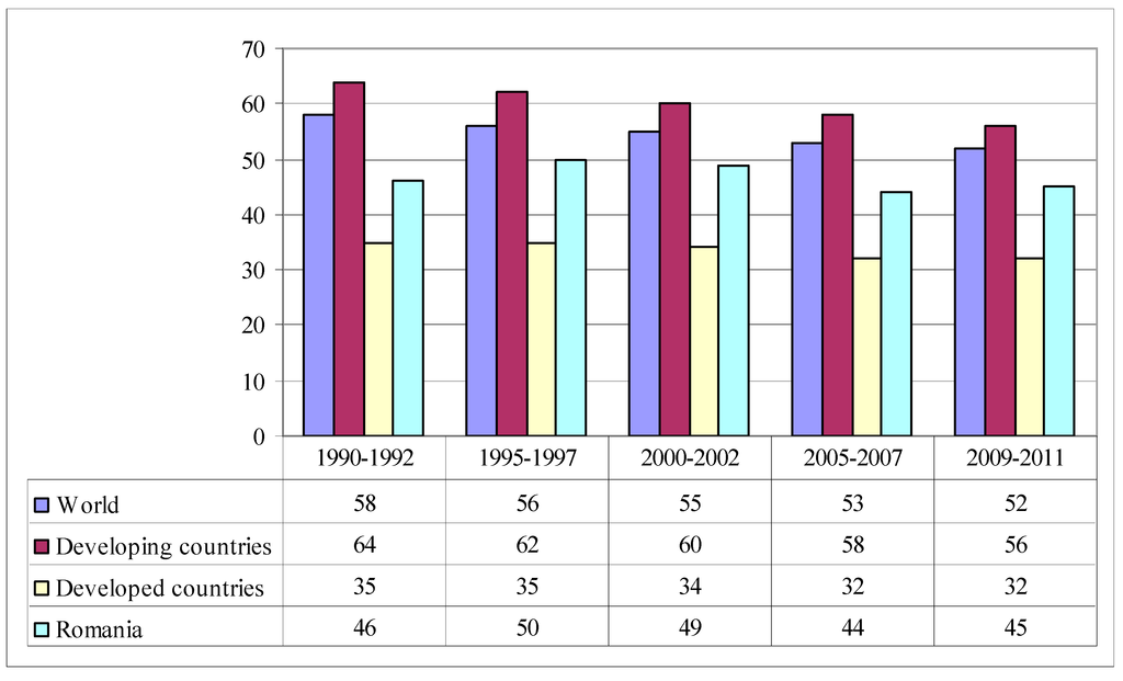 Food security is analyzed periodically by FAO. The last reports indicate that about one in every nine people in the world still has insufficient food for an active and healthy life. “The vast majority of these undernourished people live in developing countries, where an estimated 791 million were chronically hungry in 2012–2014”, FAO [2] (p. 8). Still, “since 1990–1992, the prevalence of under-nourishment has fallen from 18.7% to 11.3% in 2012–14 for the world as a whole, and from 23.4% to 13.5% for developing regions”, FAO [2] (p. 4).