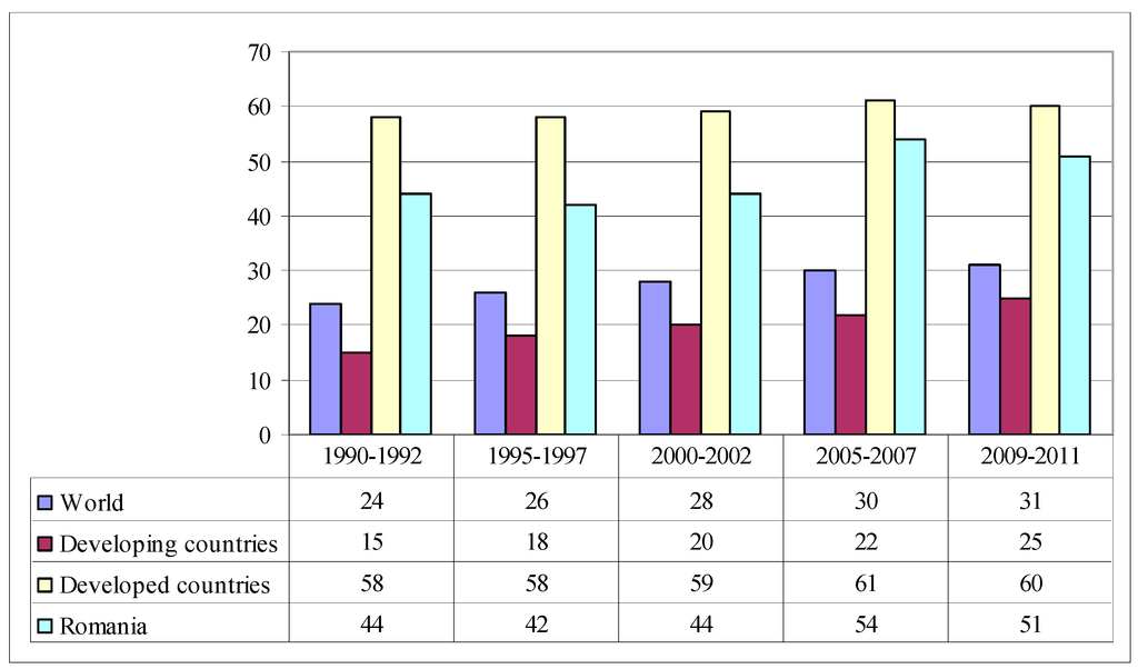 Reports of the Economist Intelligence Unit [22] (pp. 9,10) assess the global food security index in 2012, considering food affordability, availability and quality. Countries are ranked on a scale from 0 to 100. Romania ranks 38th, with a score of 62.5 (China ranks on the same place). As regards to affordability, Romania ranked 11th, in upper middle income class (US$ 3976–12,275 per capita). In 2014, the overall score fell for Romania compared with two years before: 61.3. In 2014, Romania ranks 44th. As regards rankings by regional classification, the place of Romania within European countries is the 23rd out of 26 (Economist Intelligence Unit [23] (pp. 13,16).