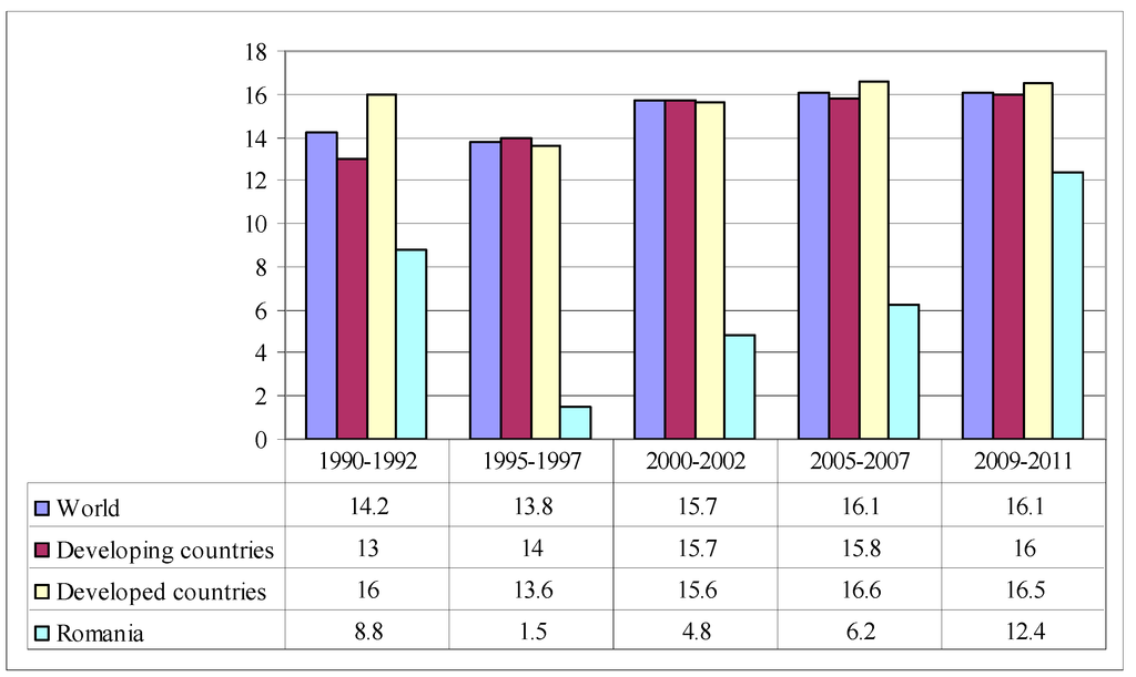The cereal import dependency ratio is calculated by dividing the level of cereal import to cereal supply (calculated itself as cereal production plus cereal import minus cereal export). Low levels show the fact that a country can ensure food security from domestic agricultural production. In Romania, 12% of supply is provided by imports, while worldwide its level is 16%. Romania is less dependent on cereal imports than other countries of the world. A negative aspect should be mentioned. The cereal import dependency ratio increased since 1990 to 2011, from 8.8% to 12% (Figure 7).