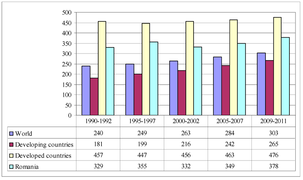 In Figure 3, the human food consumption expressed in kilocalories per person per day shows that, in Romania, dietary energy supply is 3363, higher than world average of 2881, and close to its level in developed countries of 3399 kcal/person/day. For both groups of countries: developed and developing, and for Romania and worldwide, the dietary energy supply increased since 1990 to present, and stabilized around 2769 kcal/person/day in developing countries and to 3399 kcal/person/day in developed countries.