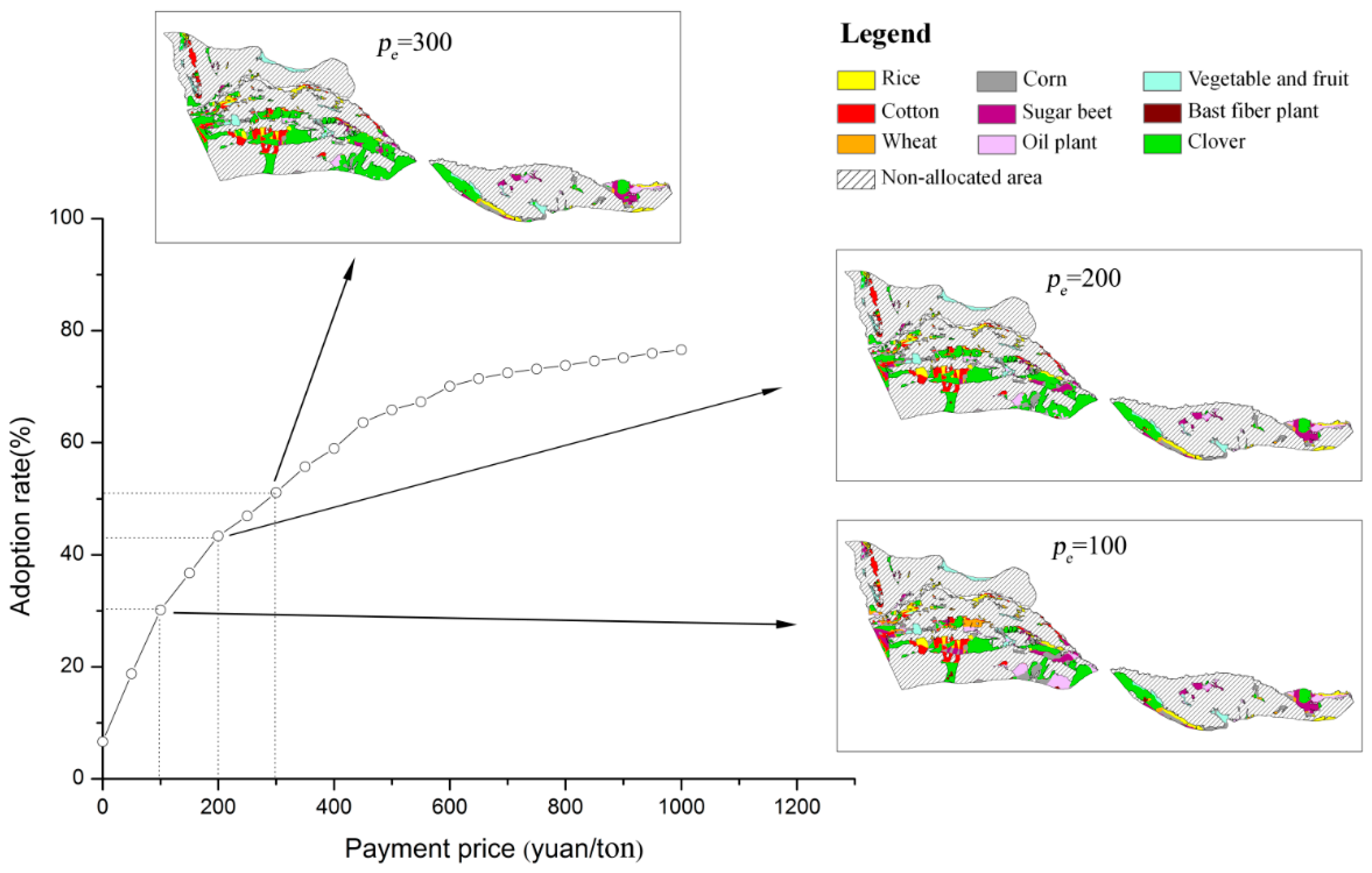 | Payment price (yuan/ton) | Reference scenario | pe = 50 | pe = 100 | pe = 150 | pe = 200 | pe = 250 | pe = 300 | pe = 350 | pe = 400 | pe = 450 | pe = 500 |
