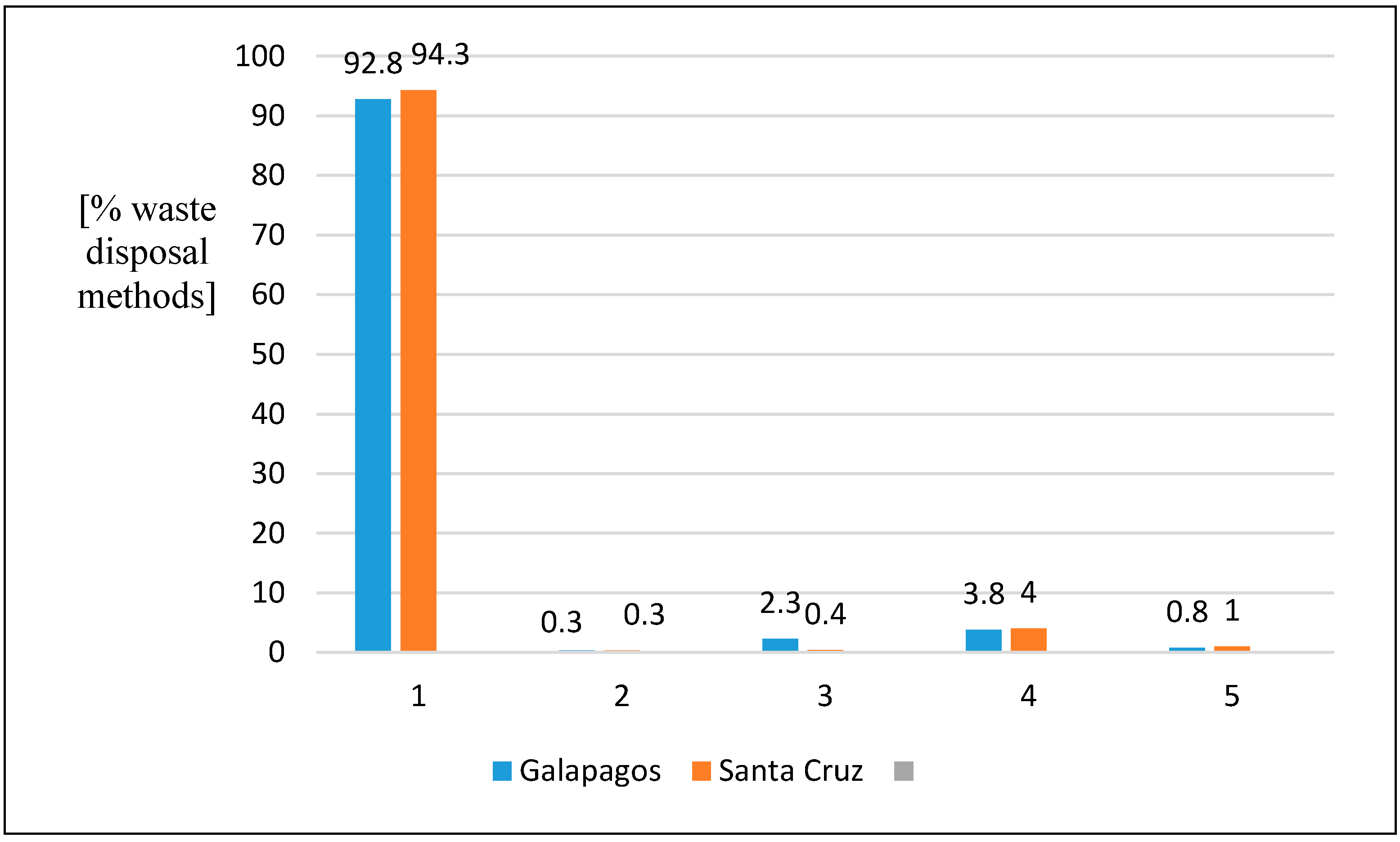Comparison of municipal solid waste (MSW) disposal methods by the population of the Province of Galapagos, and those for the population of Santa Cruz [16] (1 = Municipal service; 2 = Abandonment on roads, rivers, soil; 3 = Incineration; 4 = Recycling/landfilling; 5 = Other).